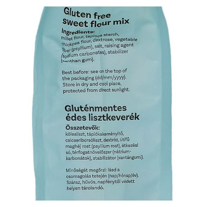 Összetevők: kölesliszt, tápiókakeményítő, csicseriborsóliszt, dextróz, útifű maghéj rost (psyllium rost), étkezési só, térfogatnövelő szer (nátrium-karbonátok), stabilizátor (xantángumi).