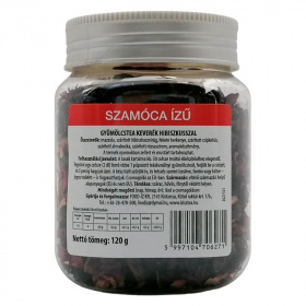 Mazsola, szárított hibiszkuszvirág, fekete berkenye, szárított csipkehús, szárított almakocka, szárított rózsaszirom, aromakészítmény. A termék nyomokban zellert és mustárt tartalmazhat. Felhasználási javaslat: A tasak tartalma kb. 30 csésze teaital elkészítéséhez elegendő. Tegyünk egy csésze (2 dl) forró vízbe 1 púpozott teáskanálnyi gyümölcsteát, fedjük be a csészét, és 5 percig hagyjuk ázni. A kész italt szűrjük le, és tetszés szerint ízesítve, forrón vagy hűtve - jeges teaként - is fogyaszthatjuk.Tárolása:száraz,hűvös,fénytől védett helyen.