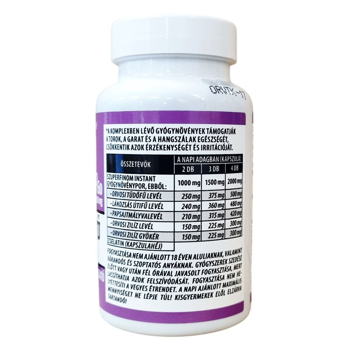 Az Orvosi Tüdőfű Komplex szuperfinom instant gyógynövénypor tartalmú étrend-kiegészítő kapszula, amely a torok, garat és hangszálak nyugtatására készül. A komplex összeállításában orvosi tüdőfű, lándzsás útifű, papsajt mályva levél, valamint orvosi zilíz levél és gyökér található. A kapszula fogyasztása többféleképpen ajánlott, például a kapszula tartalmát forró, legalább 50-60 °C-os vízzel felöntve teaként kis kortyokban elfogyasztva, vagy folyékony mézben elkeverve lassan elfogyasztva. Fontos a megfelelő dózis betartása és a gyermekek elől való elzárás. A termék nem helyettesíti a vegyes étrendet, és gyógyszerekkel egyidejű fogyasztás előtt célszerű orvosi tanácsot kérni.