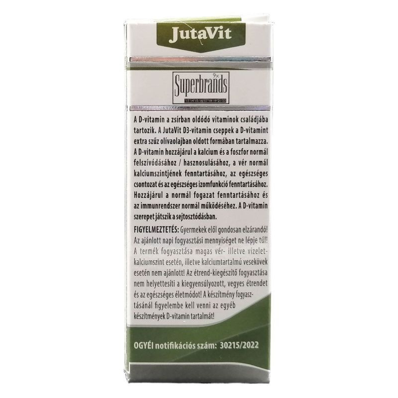 A JutaVit D3-vitamin cseppek a D-vitamint extra szűz olívaolajban oldott formában tartalmazza. A D-vitamin hozzájárul a kalcium és a foszfor normál felszívódásához / hasznosulásához, a vér normál kalciumszintjének fenntartásához, az egészséges csontozat és az egészséges izomfunkció fenntartásához. Hozzájárul a normál fogazat fenntartásához és az immunrendszer normál működéséhez. A D-vitamin szerepet játszik a sejtosztódásban.
