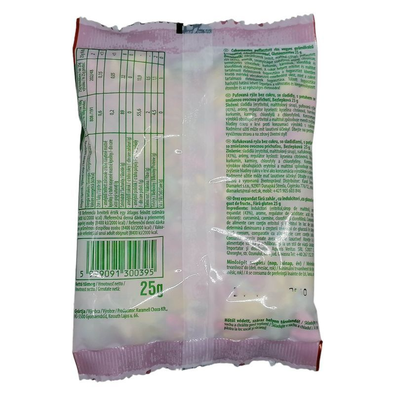 Összetevők: Puffasztott rizs, édesítőszerek: eritrit, maltitol-szirup, aromák, savanyúságot szabályozó anyag: citromsav, természetes színezékek: karotinok, kurkumin, kárminok, klorofillok és klorofillinek rézkomplexei.