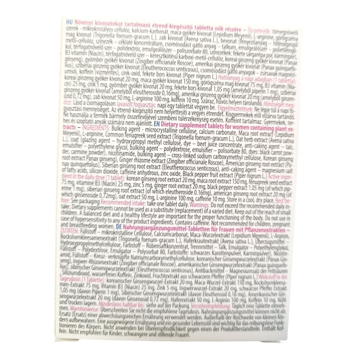 Mikrokristályos cellulóz, kalcium-karbonát, maca-gyökér-kivonat (Lepidium meyenii), L-arginin, görögszéna-kivonat (Trigonella foenum-graecum L.), zabkivonat (Avena sativa L.), hipromellóz, talkum, emulgeálószer: poliszorbát 80, színezékek: fekete sárgarépa-por, karmin, B3-vitamin (niacinamid), cink, inulin, koreai ginzeng-kivonat (Panax ginseng), amerikai ginzeng-kivonat (Panax quinquefolius), tajgagyökér-kivonat (Eleutherococcus senticosus), fekete bors-kivonat (Piper nigrum L.), koffein, antioxidáns: magnézium-sztearát, szilícium-dioxid.