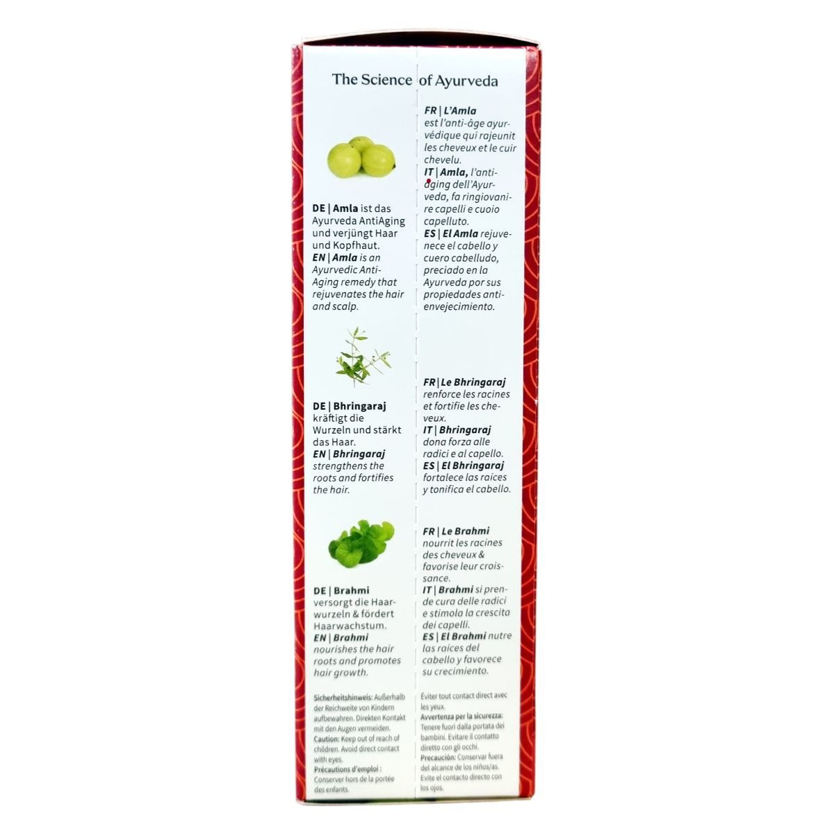 Amla – anti-aging összetevő, amely megújítja a hajat és a fejbőrt; Bhringaraj – erősíti a hajgyökereket és támogatja a hajnövekedést; Brahmi – táplálja a hajgyökereket, serkenti a haj növekedését.