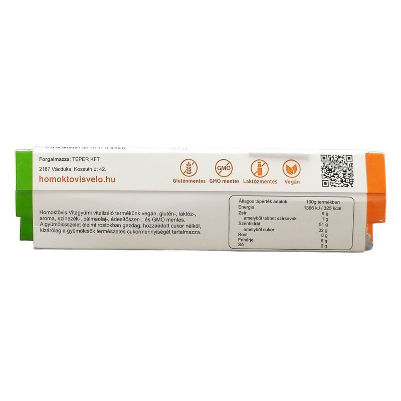 Kizárólag növényi alapanyagokból, kíméletes gyártási eljárással előállított magas vitamin és nyomelem tartalmú, hasznos élettani hatású natúr gyümölcsszelet.