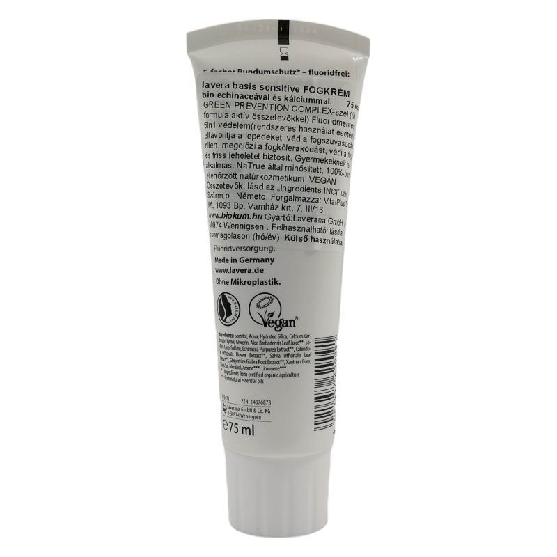 Green prevention complex-szel (új formula aktív összetevőkkel) Fluoridmentes. 5in1 védelem: eltávolítja a lepedéket, véd a fogszuvasodás ellen, megelőzi a fogkőlerakódást, védi a fogínyt és friss leheletet biztosít. Gyermekeknek is alkalmas. Összetevők: Sorbitol, Aqua, Hydrated Silica, Calcium Carbonate, Xylitol, Glycerin, Aloe Barbadensis Leaf Juice**, Sodium Coco-Sulfate, Echinacea Purpurea Extract**, Calendula Officinalis Flower Extract**, Salvia Officinalis Leaf Extract**, Glycyrrhiza Glabra Root Extract**, Xanthan Gum, Maris Sal, Menthol, Aroma***, Limonene*** (**ellenörzőtt ökológiai termesztésből ***természetes esszenciális olajok)