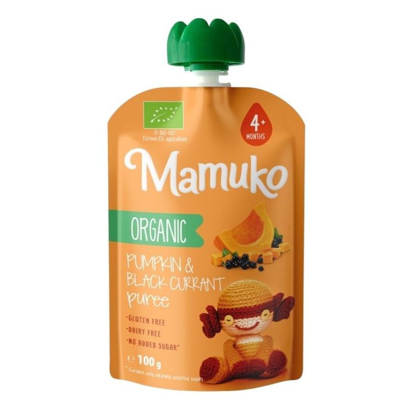 Bio sütőtök és fekete ribizli püré. Gluténmentes, tejmentes, nem tartalmaz hozzáadott cukrot.