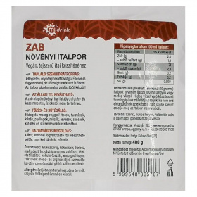 400 g porból akár 4 l italt is készíthet, ezzel csökkentve a hulladékképződést, így a MILDRINK Zab italport környezetbarát terméknek tekinthetjük. Felhasználás: Termékünkkel kiválthatja étrendjében az állati eredetű tejet. Használható reggeli italok elkészítéséhez, gabonapelyhek, müzlikeverékek fogyasztásához, de szélesközűen alkalmazható a sütés-főzés minden területén (pl.: kásák, sütemények, levesek, főzelékek, krémek és pudingok készítésénél). Elkészítése: Keverjen legalább 10g (1 evőkanál vagy 3 kávéskanál) italport 100ml meleg vagy langyos vízhez (hideg ital készítésénél használjon turmixgépet). Ha nem érzi elég tejesnek az elkészült italt, ízlés szerint emelje a keverékben az italpor arányát. Tárolás: Maximum 25 °C-on 70% relatív nedvességtartalom mellett. Felbontás után gondosan zárja vissza a csomagot, ezzel megakadályozhatja a termék csomósodását. Összetevők: glükózszirup, kókuszzsír, dextróz, maltodextrin, gluténmentes zabliszt 15%, stabilizátor: kálium-foszfát (E340), emulgeálószer: zsírsavak mono- és digliceridjei (E471), színezék: karotin, csomósodást gátló: szilícium-dioxid.