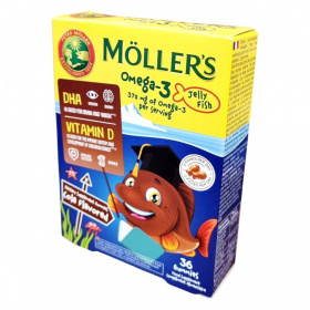 Möller’s Omega-3 halacska gumivitamin étrend-kiegészítő gyerekeknek D-vitaminnal, kóla ízesítéssel. A termék DHA-t tartalmaz, amely hozzájárul az agy és a látás normál működéséhez. A kedvező hatás eléréséhez napi min. 250 mg DHA szükséges. A D-vitamin hozzájárul az immunrendszer normál működéséhez, valamint a gyermekek csontozatának normál növekedéséhez és fejlődéséhez.
