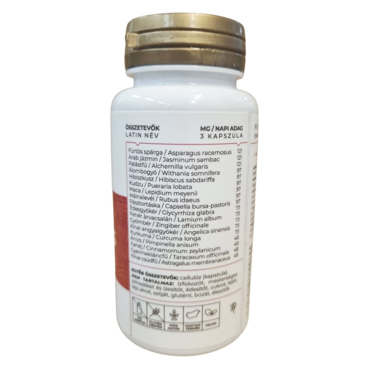 Fürtös spárga (Asparagus racemosus) 121 mg, Arab jázmin (Jasminum sambac) 121 mg, Palástfű (Alchemilla vulgaris) 97 mg, Alombogyó (Withania somnifera) 97 mg, Hibiszkusz (Hibiscus sabdariffa) 97 mg, Kudzu (Pueraria lobata) 97 mg, Maca (Lepidium meyenii) 97 mg, Málnalevél (Rubus idaeus) 97 mg, Pásztortáska (Capsella bursa-pastoris) 97 mg, Édesgyökér (Glycyrrhiza glabra) 73 mg, Fehér árvacsalán (Lamium album) 73 mg, Gyömbér (Zingiber officinale) 73 mg, Kínai angyalgyökér (Angelica sinensis) 73 mg, Kurkuma (Curcuma longa) 73 mg, Ánizs (Pimpinella anisum) 48 mg, Fahéj (Cinnamomum zeylanicum) 48 mg, Gyermekláncfű (Taraxacum officinale) 48 mg, Kínai csűdfű (Astragalus membranaceus) 48 mg.