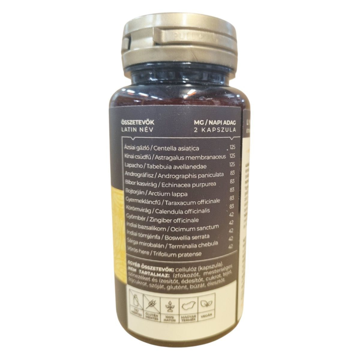 Ázsiai gázló: 125 mg, Kínai csüdfű: 125 mg, Lapacho: 83 mg, Andrográfisz: 83 mg, Bíbor kasvirág: 83 mg, Bojtorján: 83 mg, Gyermekláncfű: 83 mg, Körömvirág: 42 mg, Gyömbér: 42 mg, Indiai bazsalikom: 42 mg, Indiai tömjénfa: 42 mg, Sárga mirobalán: 42 mg, Vörös here: 42 mg