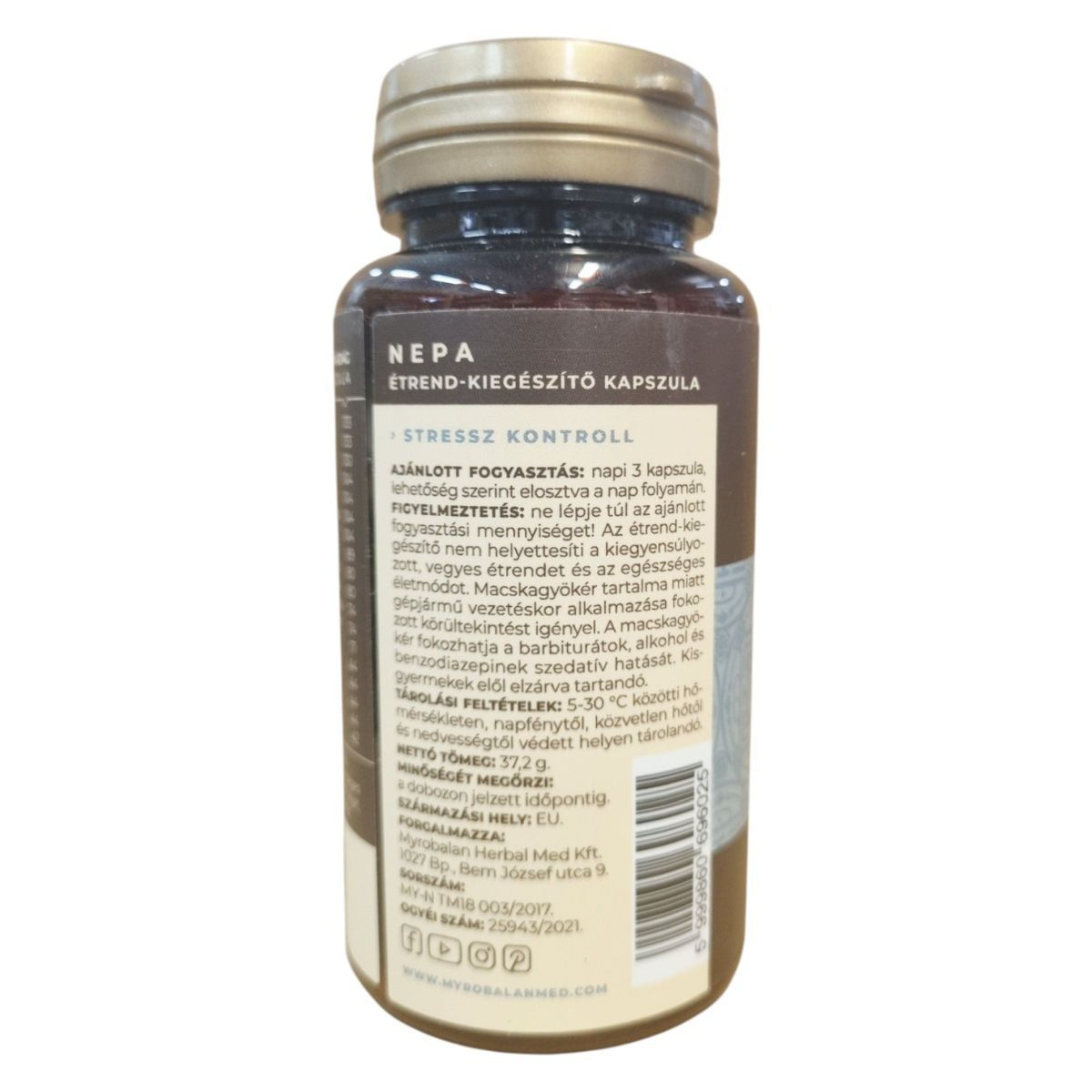 A Myrobalan Nepa egy 60 kapszulás kiszerelésű étrend-kiegészítő, amely különféle gyógynövények komplex keverékét tartalmazza, mint például az álombogyó, orvosi citromfű és macskagyökér. Ezek az összetevők hozzájárulhatnak a stressz kezeléséhez és a nyugalom támogatásához. A termék vegán, gluténmentes és laktózmentes, így széles körben alkalmazható különböző étrendi igények mellett. A termék használata során fontos betartani az ajánlott napi mennyiséget, és figyelembe venni a figyelmeztetéseket, különösen a macskagyökér tartalom miatt. A termék EU-ból származik, és a Myrobalan Herbal Med Kft. forgalmazza.