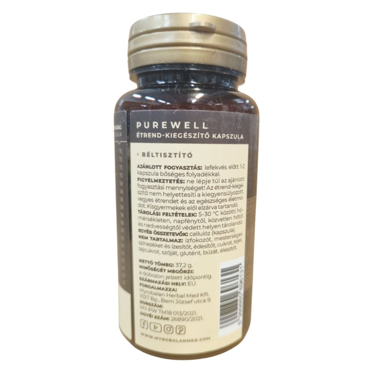 A MYROBALAN PureWell bél tisztító étrend-kiegészítő kapszula egy komplex gyógynövény-keverék, amely különféle növényi összetevőket tartalmaz, mint például a bibhitaki, indiai egres, kínai rebarbara és más gyógynövények. Ezek az összetevők hozzájárulhatnak az emésztőrendszer támogatásához és a bél tisztításához. A termék vegán, gluténmentes és laktózmentes, így különböző étrendi igényeknek is megfelelhet. A kapszulák 100% natúr összetevőket tartalmaznak, és magyar termékként kerülnek forgalomba. Az ajánlott fogyasztás lefekvés előtt 1-2 kapszula bőséges folyadékkal. Fontos, hogy az étrend-kiegészítő nem helyettesíti a kiegyensúlyozott étrendet és az egészséges életmódot.