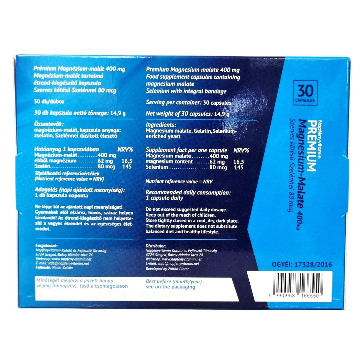 A Napfényvitamin prémium minőségű Magnesium-Malate terméke magnézium-malatot tartalmaz kapszulánként 400 mg dózisban, melyből 62 mg tiszta magnézium származik. A készítmény szerves kötésű szelénnel, 80 mcg mennyiségben dúsított, amely hozzájárulhat a szervezet optimális szelénellátásához. Az étrend-kiegészítő 30 darab kapszulát tartalmaz, amelyek nettó tömege 14,9 gramm. Az összetevők között szerepel még zselatin és szelénnel dúsított élesztő. A termék nem tartalmaz GMO-t, hozzáadott cukrot, laktózt, titán-dioxidot és doppinganyagokat, ami garantálja a tiszta és prémium minőséget. Az adagolás egyszerű: napi egy kapszula, amely kiegészítheti a kiegyensúlyozott étrendet és az egészséges életmódot. Az összes adalékanyag és a gyártási minőség megfelel a GMP szabványoknak, a termék hivatalos OGYÉI engedéllyel rendelkezik. A tárolás hűvös, száraz helyen, gyermekektől elzártan javasolt.