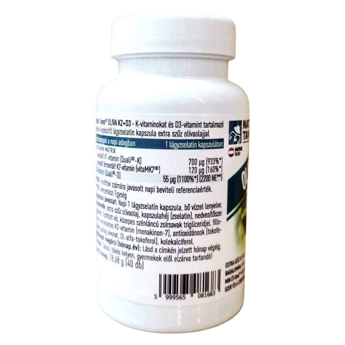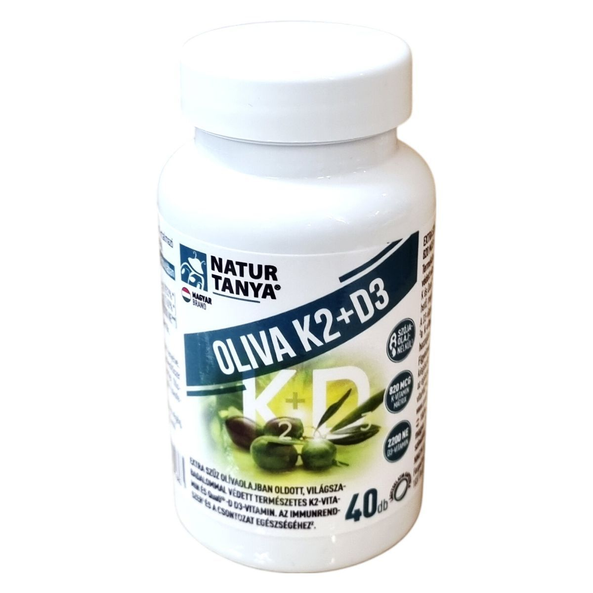 A Natur Tanya® OLIVA K2+D3 egy prémium minőségű étrend-kiegészítő, amely természetes K2-vitamint (vitaMK7®), K1-vitamint (Quali®-K) és D3-vitamint (Quali®-D) tartalmaz extra szűz olívaolajban oldva. A termék világszabadalommal védett K2-vitamint tartalmaz, továbbá fenntartható, nyomonkövethető gyártásból származó, megbízható alapanyagokat használ. A benne lévő D3-vitamin hozzájárulhat az immunrendszer egészséges működéséhez, míg a K- és D3-vitamin együttes hatásuk révén támogathatják az egészséges csontozat fenntartását. A készítmény nem tartalmaz mesterséges színezéket, tartósítószert és aromát, valamint hozzáadott szójaolajat sem. Magyar tulajdonú cég terméke, mely megvásárlásával hazai munkahelyeket támogat.