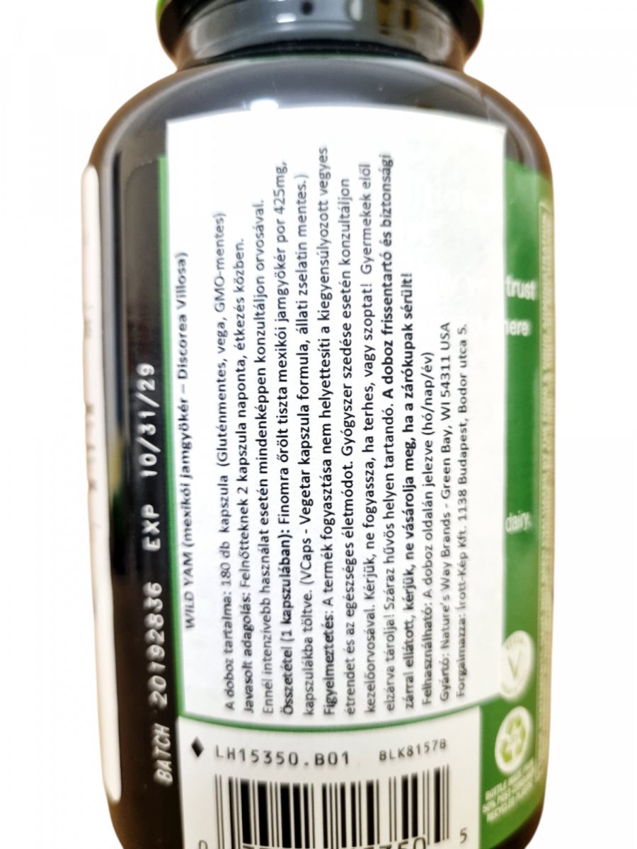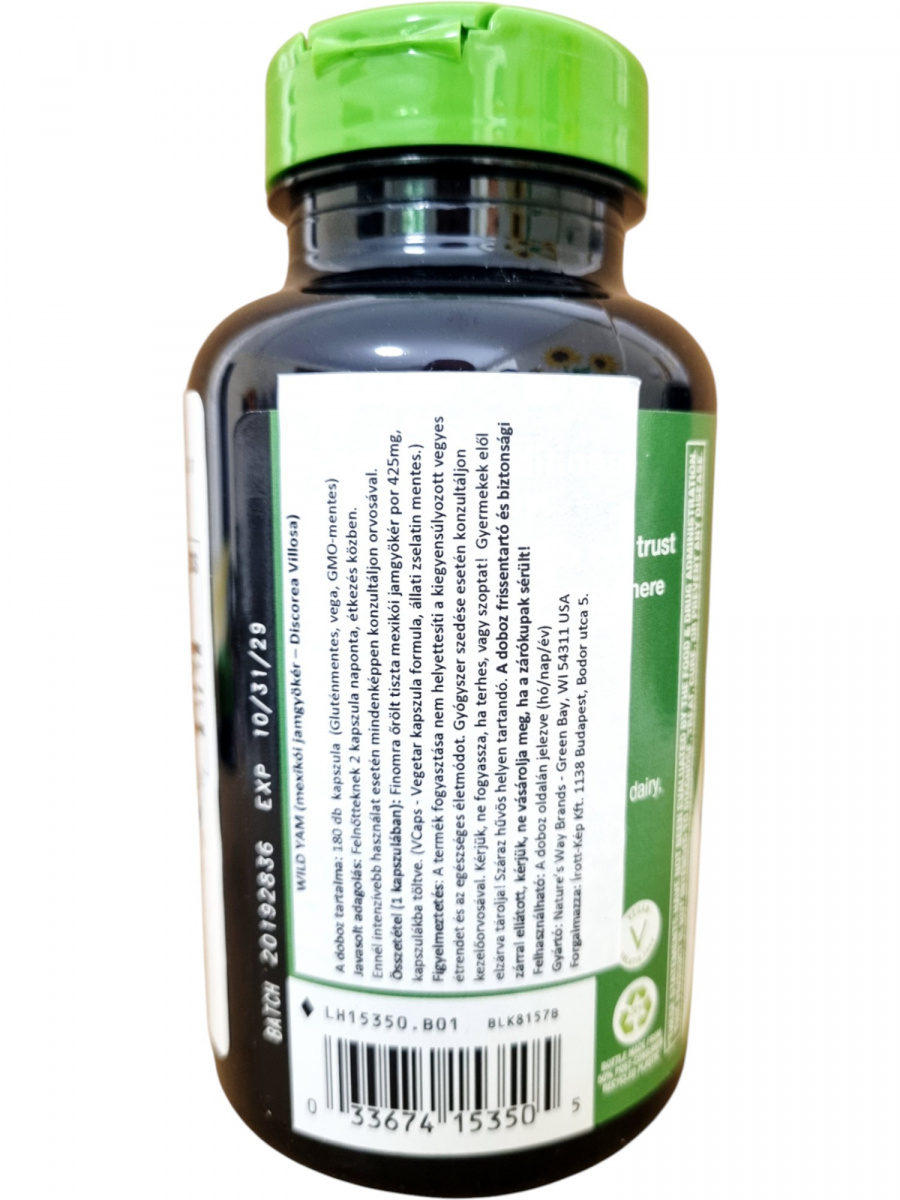 A Nature's Way Wild Yam Root kapszula 700 mg vad jam gyökér kivonatot tartalmaz adagonként. A termék kifejezetten nők számára készült, hagyományos népi felhasználása alapján hozzájárulhat a hormonális egyensúly támogatásához. A kapszula vegán, gluténmentes és GMO-mentes összetételű, így széleskörűen beilleszthető különböző étrendekbe. A biztonságos használat érdekében az ajánlott napi adagot nem szabad túllépni, és különösen fontos, hogy várandósság, szoptatás, illetve gyógyszerszedés mellett szakemberrel történjen egyeztetés. Praktikus 180 darabos kiszerelése hosszabb időre biztosítja a folyamatos kiegészítést.