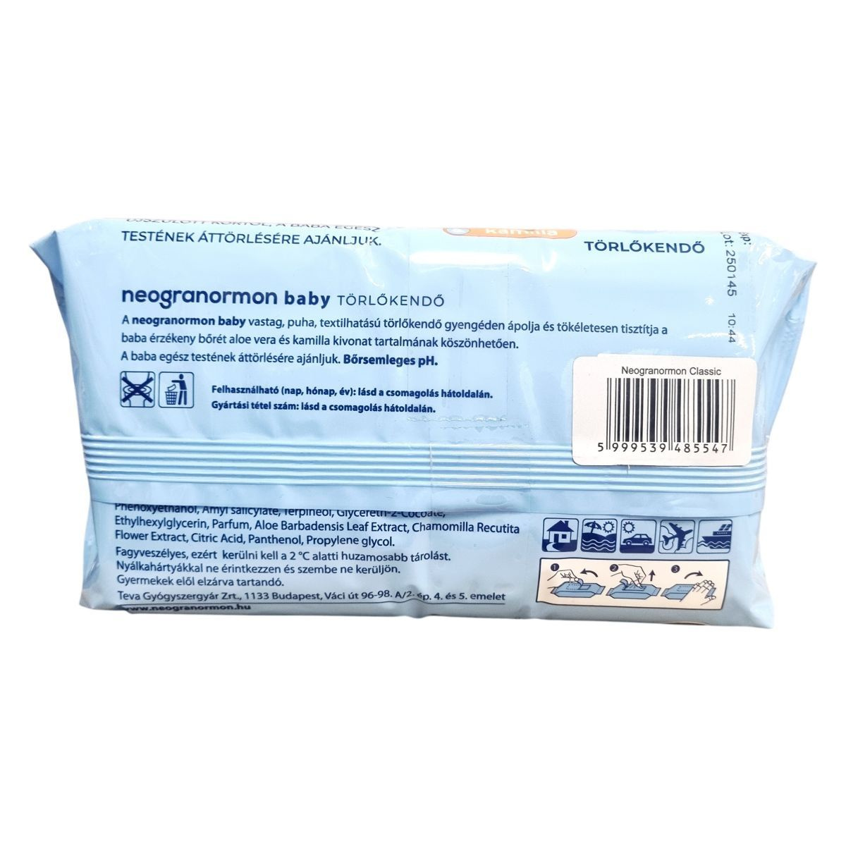A neogranormon baby törlőkendő aloe vera és kamilla kivonat tartalmának köszönhetően gyengéden ápolja a baba bőrét, bőrsemleges pH-val rendelkezik. Vastag, puha, textilhatású anyaga biztosítja a kíméletes és hatékony tisztítást. A termék műanyagot tartalmaz és újszülött kortól használható a baba egész testének áttörlésére. A gyártási tétel szám és a felhasználhatóság időpontja megtalálható a csomagolás hátoldalán.
