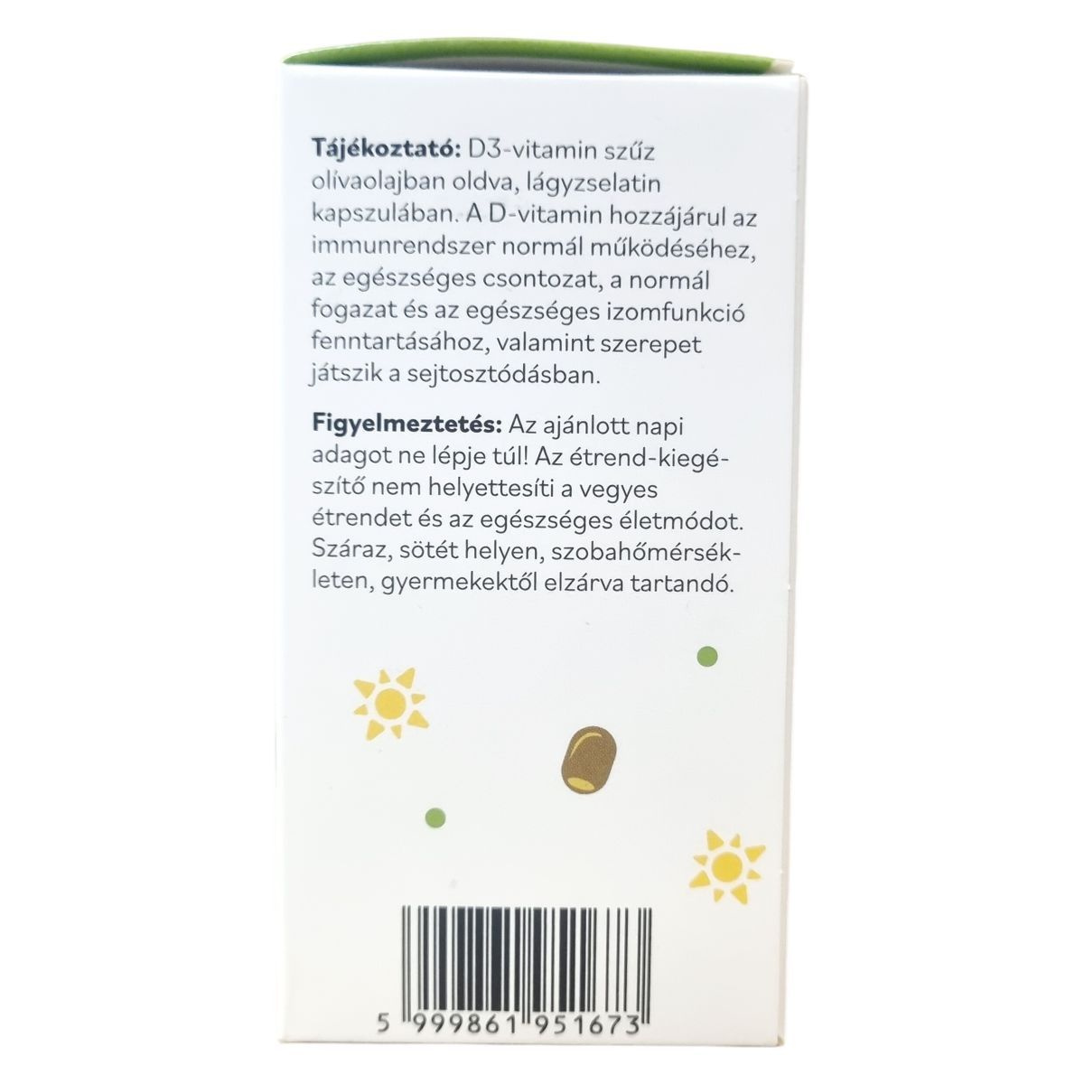 A D3-vitamin (kolekalciferol) egy zsírban oldódó vitamin és prohormon, amely a szervezetben aktív hormonszerű vegyületté alakul. A bőrben UVB-sugárzás hatására képződik, majd a májban és a vesében történő átalakulás után a kalcium- és foszfát-anyagcsere szabályozásában játszik szerepet. Hozzájárulhat a normál csontozat és fogazat fenntartásához, valamint támogathatja az immunrendszer megfelelő működését. Részt vesz a sejtosztódási folyamatok szabályozásában és az izomműködés fenntartásában is. Hiánya csökkent napfény-expozíció vagy elégtelen bevitel esetén alakulhat ki. Megfelelő adagolás mellett biztonságos, ugyanakkor túladagolása hiperkalcémiához vezethet. Egyéni egészségügyi állapot vagy gyógyszerszedés esetén javasolt szakemberrel konzultálni.