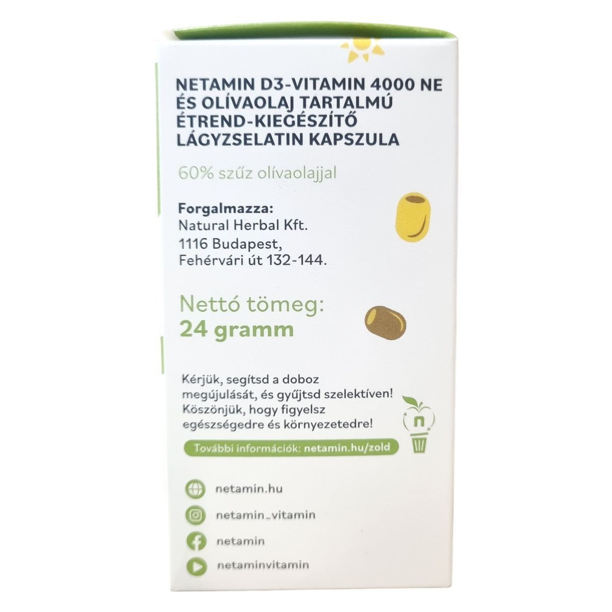 A netamin D3-vitamin 4000 NE + olívaolaj étrend-kiegészítő lágyzselatin kapszula 60% szűz olívaolajjal készül, és nagy kiszerelésben, 100 darabos csomagolásban érhető el. A termék nettó tömege 24 gramm. A csomagolás környezetbarát, és arra kérik a vásárlókat, hogy a dobozt szelektíven gyűjtsék, ezzel is támogatva a fenntarthatóságot. A termékhez további információk elérhetőek a netamin hivatalos honlapján és közösségi média felületein.