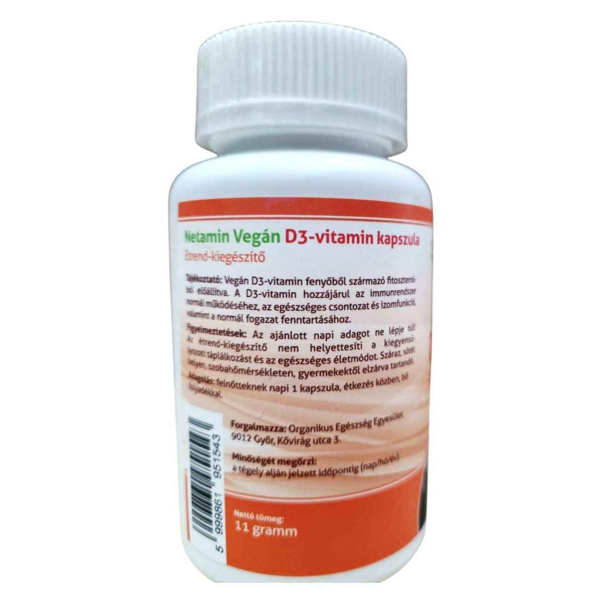 A Netamin Vegán D3-vitamin kapszula egy 100% vegán étrend-kiegészítő, amely fenyőből származó fitoszterolból előállított D3-vitamint tartalmaz. A termék napi adagja 50 µg D3-vitamint biztosíthat, ami a napi beviteli referencia érték 1000%-ának felelhet meg. A kapszulák növényi alapúak, és a termék részben újrahasznosított műanyagból készült tégelyben kerül forgalomba, ezzel is támogatva a környezetvédelmet. A termék fogyasztása hozzájárulhat az immunrendszer normál működéséhez, valamint az egészséges csontozat és izomfunkció fenntartásához. Kérjük, a terméket szelektív hulladékgyűjtőbe helyezze el használat után.