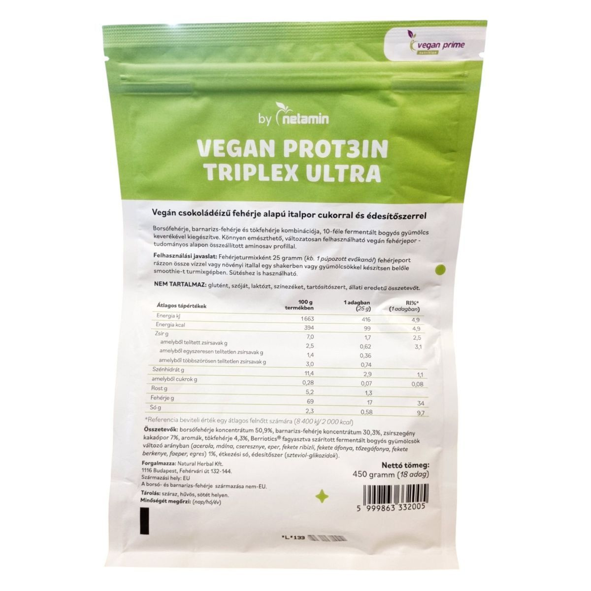 A Netamin VEGAN PROT3IN TRIPLEX ULTRA egy csokoládéízű, vegán fehérje alapú italpor, amely borsó-, barnarizs- és tökfehérje kombinációját tartalmazza. A termék 10-féle fermentált bogyós gyümölcs keverékével van kiegészítve, amely könnyen emészthető és változatosan felhasználható lehet. A termék nem tartalmaz glutént, laktózt, szóját, színezéket, tartósítószert és állati eredetű összetevőt. Az italpor tudományos alapon összeállított aminosav profillal rendelkezik, és alkalmas lehet fehérjeturmixok, smoothie-k készítésére, valamint sütéshez is felhasználható.