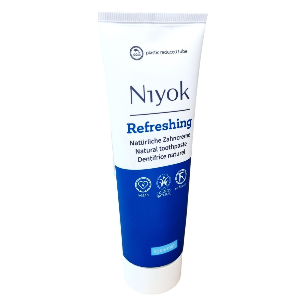 A Niyok Refreshing Natürliche Zahncreme egy Németországban gyártott, 75 ml-es vegán fogkrém, amely innovatív formulájával ásványi tisztító molekulákkal gyengéden távolítja el a lepedéket. A termék mikroműanyag- és fluormentes, így környezettudatos módon vigyázhat fogai egészségére. A frissítő fodormenta aroma kellemes lehelet frissességet és tiszta szájérzetet biztosít. A fogkrém 99,7%-ban természetes eredetű összetevőkből készült, és Cosmos minősítéssel rendelkezik. A termék használata során ügyelni kell arra, hogy szembe ne kerüljön, és hatóanyagokkal szembeni túlérzékenység esetén nem ajánlott a használata. A fogkrémet szobahőmérsékleten kell tárolni, és gyermekek elől elzárva tartandó.