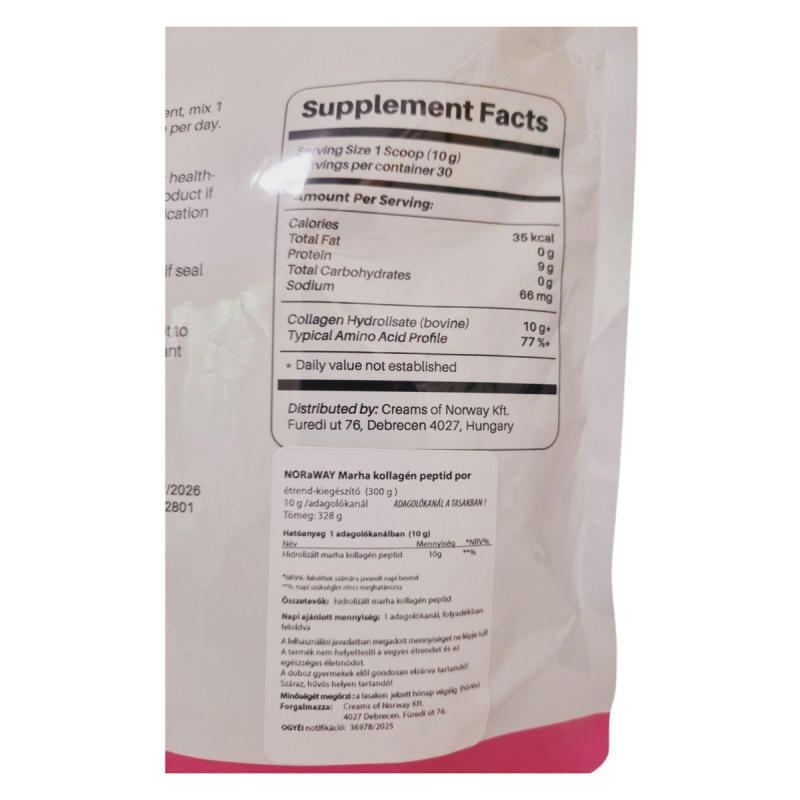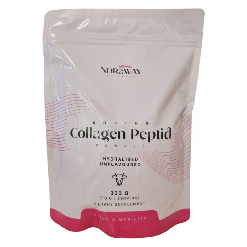 A NORaWAY BOVINE Collagen Peptid POWDER egy ízesítetlen, hidrolizált marha kollagén peptid alapú étrend-kiegészítő, amely 300 g-os kiszerelésben érhető el. A termék célja, hogy támogassa az ízületek és a mobilitás egészségét. Az ajánlott napi adag 10 g, amelyet egy adagolókanál segítségével könnyedén kimérhetünk és vízben vagy gyümölcslében feloldhatunk. A termék nem helyettesíti a vegyes étrendet és az egészséges életmódot. A csomagolás tartalmaz egy szárítószert a frissesség megőrzése érdekében, amelyet nem szabad elfogyasztani.