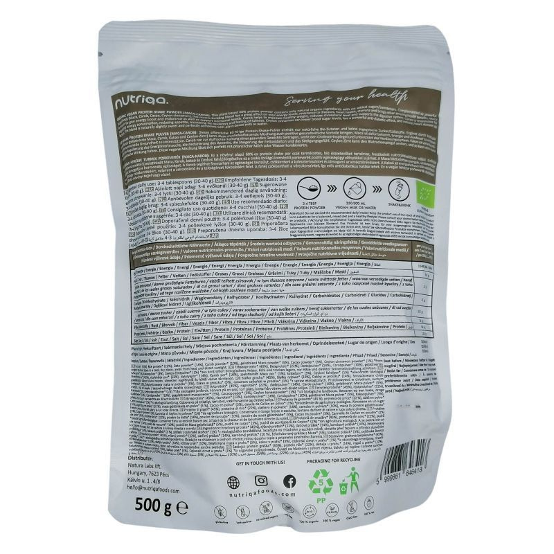 Erőteljes szuperélelmiszerekkel (zselatinizált Maca, Karob, kakaó és Ceyloni fahéj) kiegészítve ez a csokis ízvilágú izomépítő porkeverék pozitív egészségügyi előnyökkel is járhat. A Maca köztudottan energiát, állóképességet biztosít és támogatja a hormonális egészséget. A Karob segíthet fenntartani az egészséges testsúlyt, csökkenteni a koleszterinszintet és támogatni az emésztőrendszert. A Kakaó az energiafelhasználás szabályozásért, az étvágy csökkentéséért, valamint a zsíroxidáció és a teltségérzet fokozásáért felel. A fahéj csökkentheti a vércukorszintet, így erős antidiabetikus hatása lehet. Ez a vegán fehérje porkeverék tökéletesen kombinálható növényi tejjel vagy vízzel. Összetevők: borsófehérje és rizsfehérje por* (67%), datolyapor*, Karob por* (10%), zselatinizált Maca por*, kakaópor*, Ceyloni fahéjpor* *ellenőrzött ökológiai gazdálkodásból.