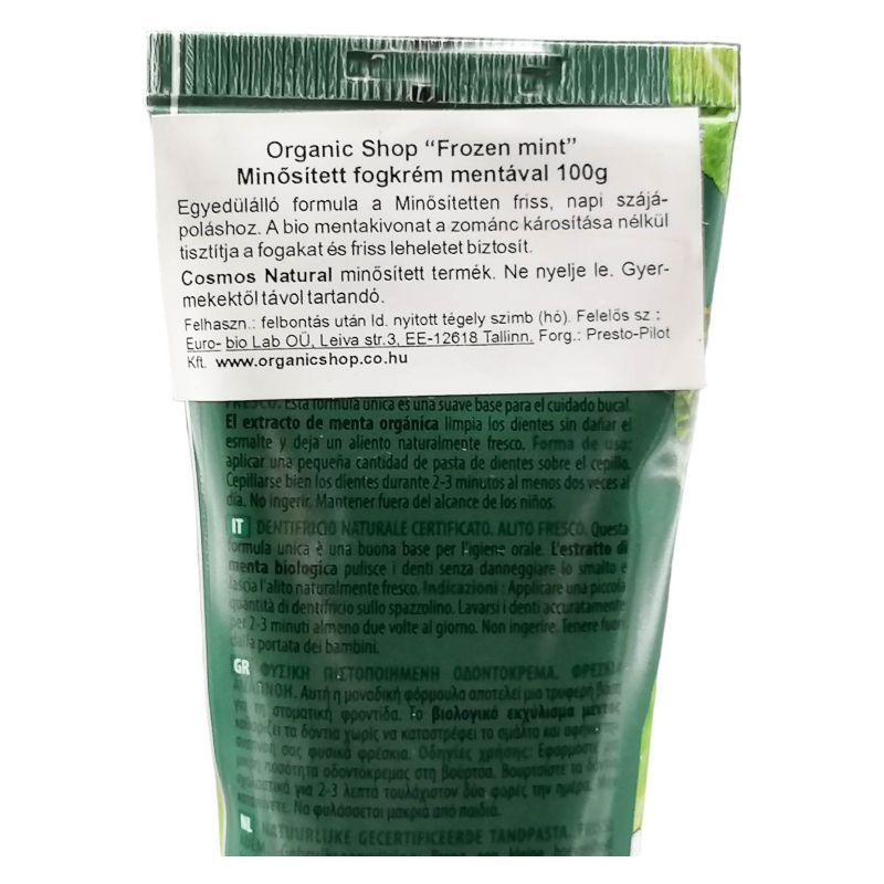 Cosmos Natural minősített termék. Ne nyelje le. Gyermekektől távol tartandó. Összetevők: Aqua, Hydrated Silica, Glycerin, Hydrogenated Starch Hydrolysate, Sodium Coco-Sulfate, Zinc Citrate, Stevia Rebaudiana Leaf/Stem Extract, Mentha Piperita Leaf Water*, Mentha Piperita Oil*, Citrus Junos Fruit Extract*, Xanthan Gum, Cellulose Gum, Menthol, Menthyl Lactate, Aroma, Citric Acid, Sodium Benzoate, Potassium Sorbate, Limonene.
