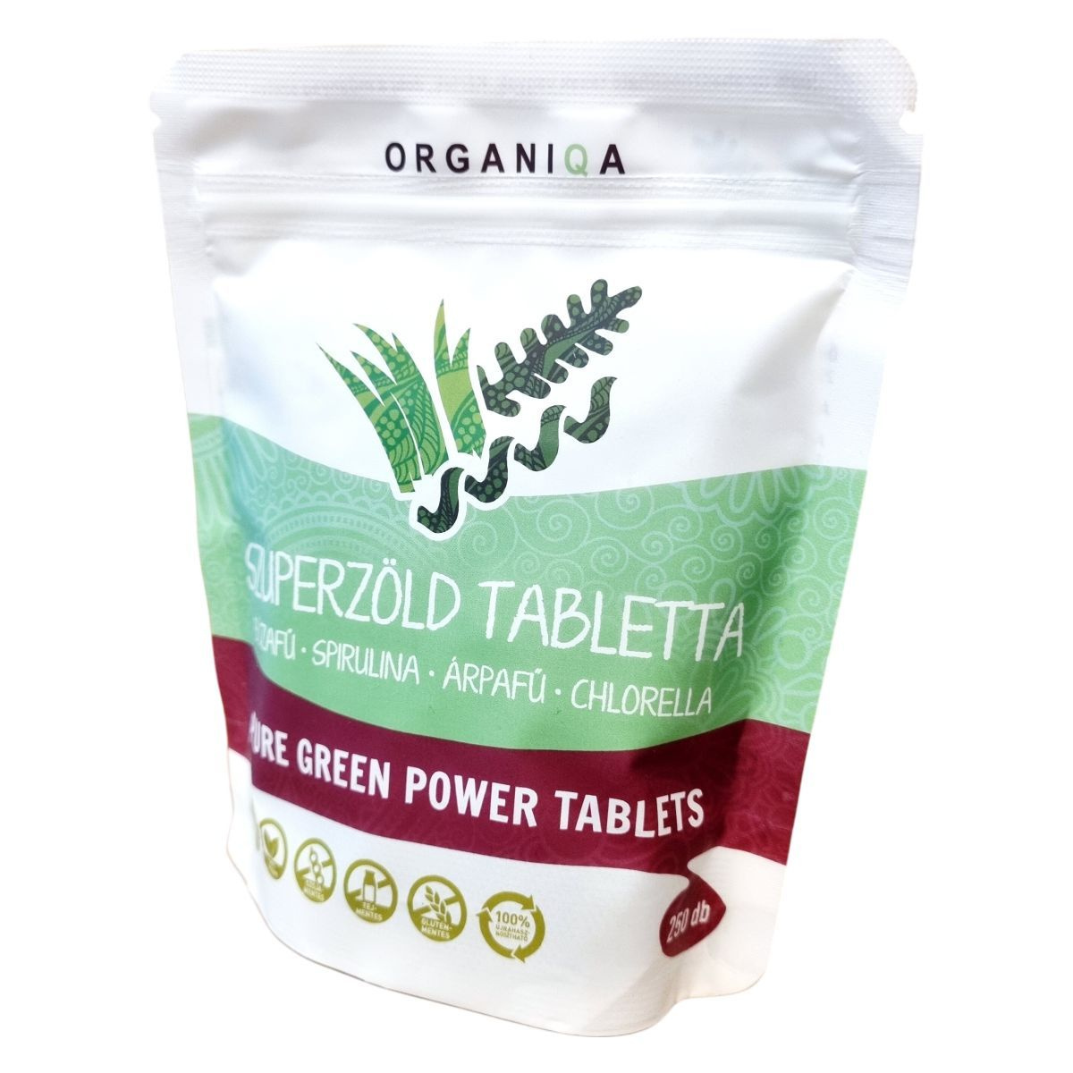 A Szuperzöld Tabletta egy bio alapanyagokból készült étrend-kiegészítő, amely búzafű, spirulina, árpafű és chlorella porokat tartalmaz. A termék 100% újrahasznosítható tasakban érkezik, és természetes módon előforduló szulfitokat tartalmazhat. Az ellenőrzött ökológiai gazdálkodásból származó termék Kínából származik, és a Biokontroll Hungária Nonprofit Kft. által ellenőrzött. A tabletták gyümölcslével vagy vízzel könnyen bevehetők.
