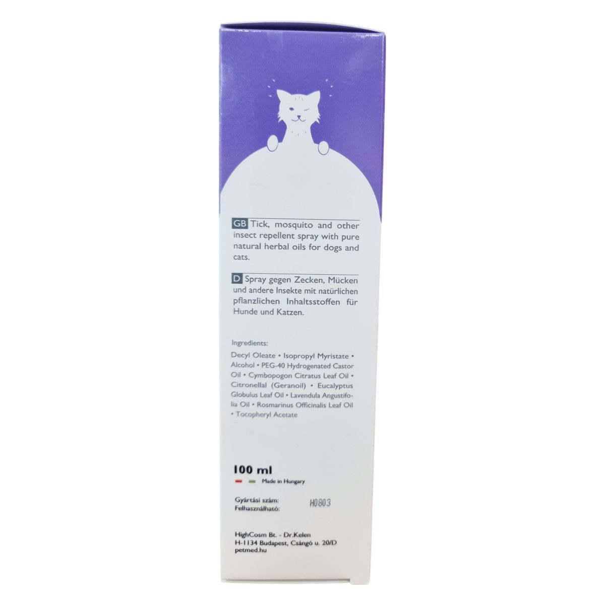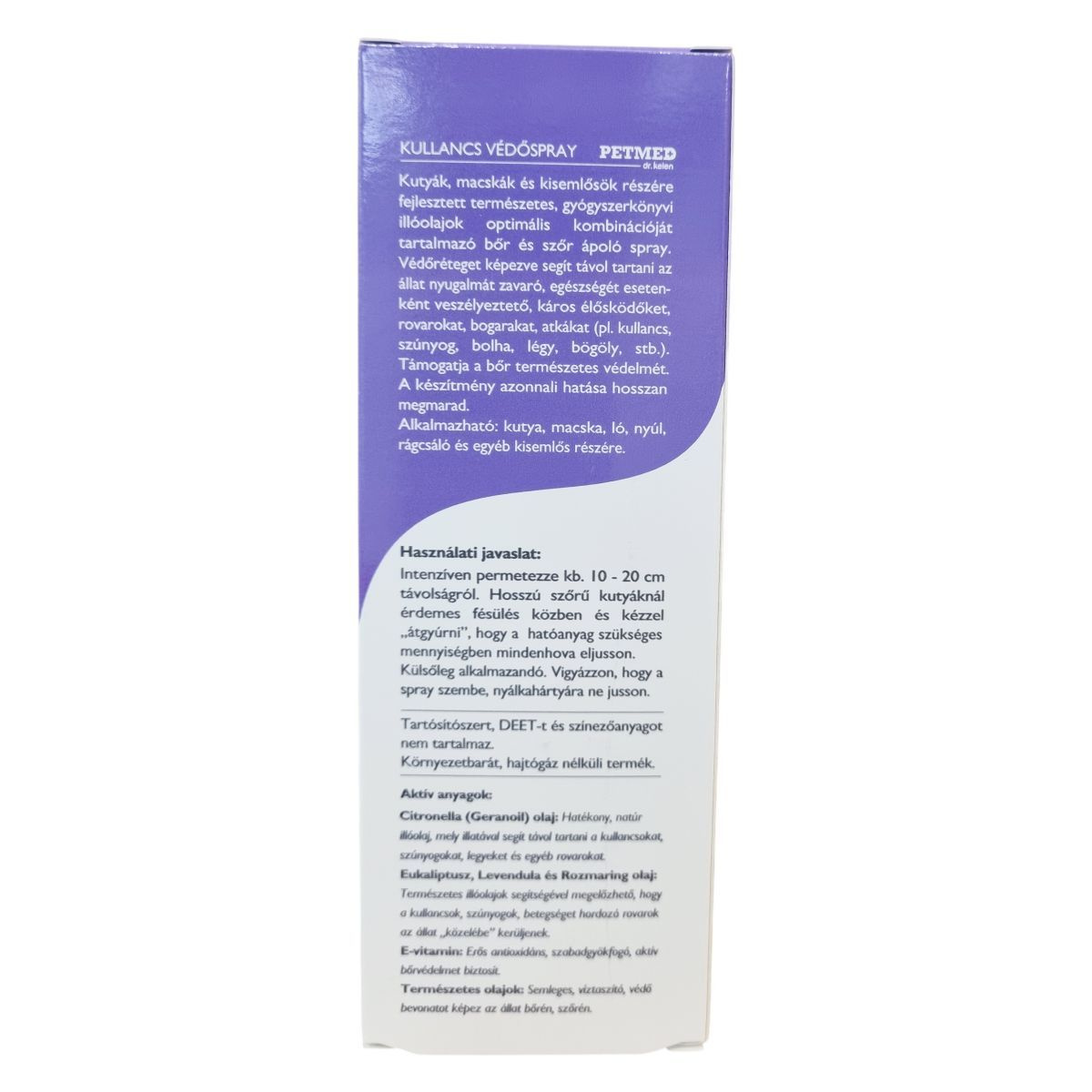 A PETMED dr.kelen Kullancs védőspray kutyák, macskák és kistestű emlősök számára készült, természetes illóolajok optimális kombinációját tartalmazó bőr- és szőrápoló készítmény. Védőréteget képezve segíthet távol tartani a kedvenc nyugalmát zavaró és egészségét veszélyeztető élősködőket, rovarokat és atkákat, például kullancsokat, szúnyogokat, bolhákat és legyeket. A készítmény azonnali hatása hosszan megmaradhat, miközben támogatja a bőr természetes védelmét. Tartósítószert, DEET-et és színezőanyagot nem tartalmaz, környezetbarát, hajtógáz nélküli termék.