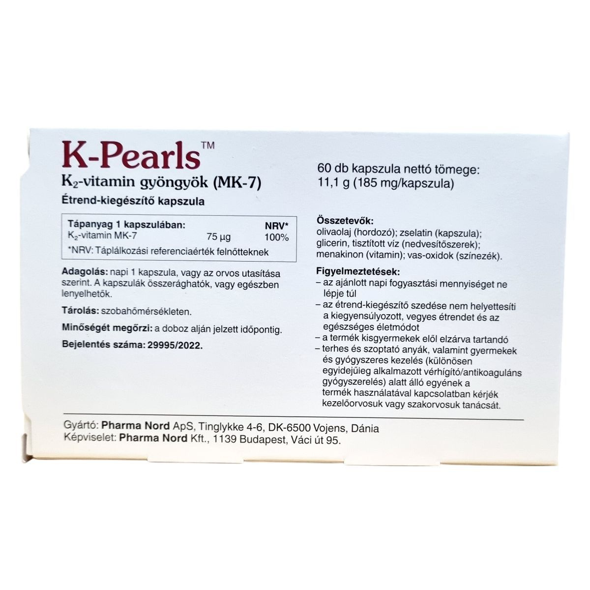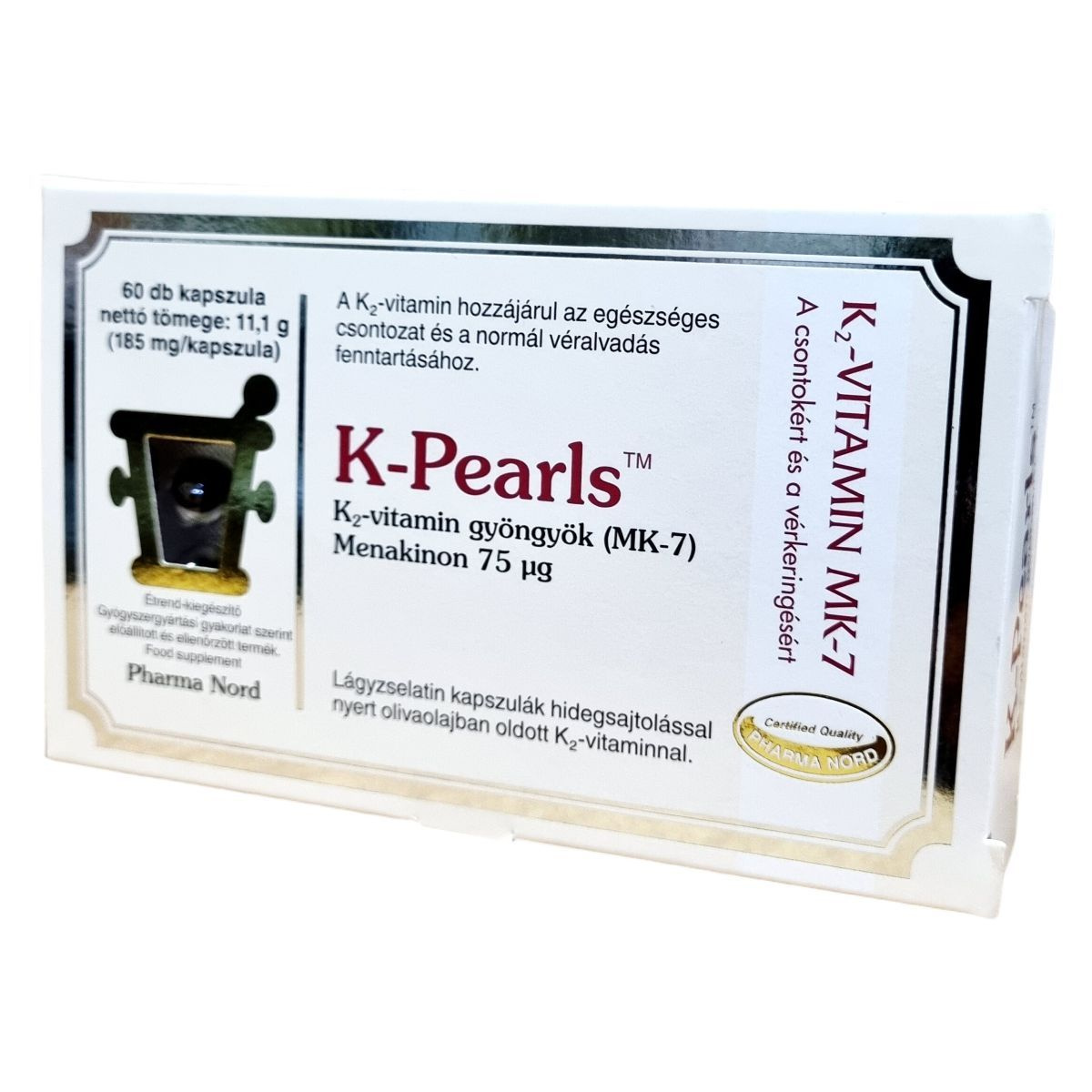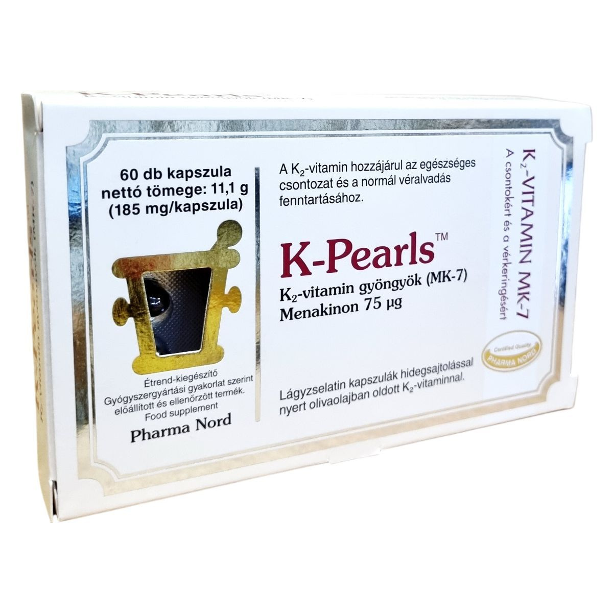 A K-Pearls™ K2-vitamin gyöngyök (MK-7) egy étrend-kiegészítő, amelyet a Pharma Nord gyárt. A termék 60 db lágyzselatin kapszulát tartalmaz, amelyek hidegsajtolással nyert olívaolajban oldott K2-vitamint tartalmaznak. A K2-vitamin hozzájárulhat az egészséges csontozat és a normál véralvadás fenntartásához. A kapszulák könnyen fogyaszthatók, akár összerágva, akár egészben lenyelve. A termék minőségét a doboz alján jelzett időpontig őrzi meg, és szobahőmérsékleten tárolandó. Fontos, hogy az ajánlott napi mennyiséget ne lépjük túl, és a termék nem helyettesíti a kiegyensúlyozott étrendet és az egészséges életmódot. Különösen figyelmet kell fordítani a terhes és szoptató anyák, valamint a gyógyszeres kezelés alatt álló egyének esetében, akiknek tanácsos orvosukkal konzultálni a termék használata előtt.