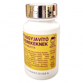Az Étvágyjavító Gyerekeknek rágótabletta célja, hogy támogassa a gyermekek étvágyát és emésztését. A termék különféle vitaminokat és ásványi anyagokat tartalmaz, amelyek hozzájárulhatnak a bélrendszer normál működéséhez és a makrotápanyagok anyagcseréjéhez. A termék 180 tablettát tartalmaz, és a Pharmacoidea Kft. gyártja. A Rubia cordifolia és gyömbér kivonatok mellett a tablettákban található kalcium, cink, B-vitaminok és más fontos tápanyagok is. A termék használata nem helyettesíti a kiegyensúlyozott étrendet és az egészséges életmódot.