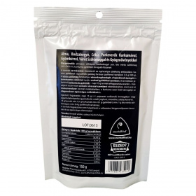 Almapor, céklapor, bodzabogyó por, bio vörös szőlőmag (HU-ÖKO 01), kurkuma, gyömbér, egyéb fűszerek.