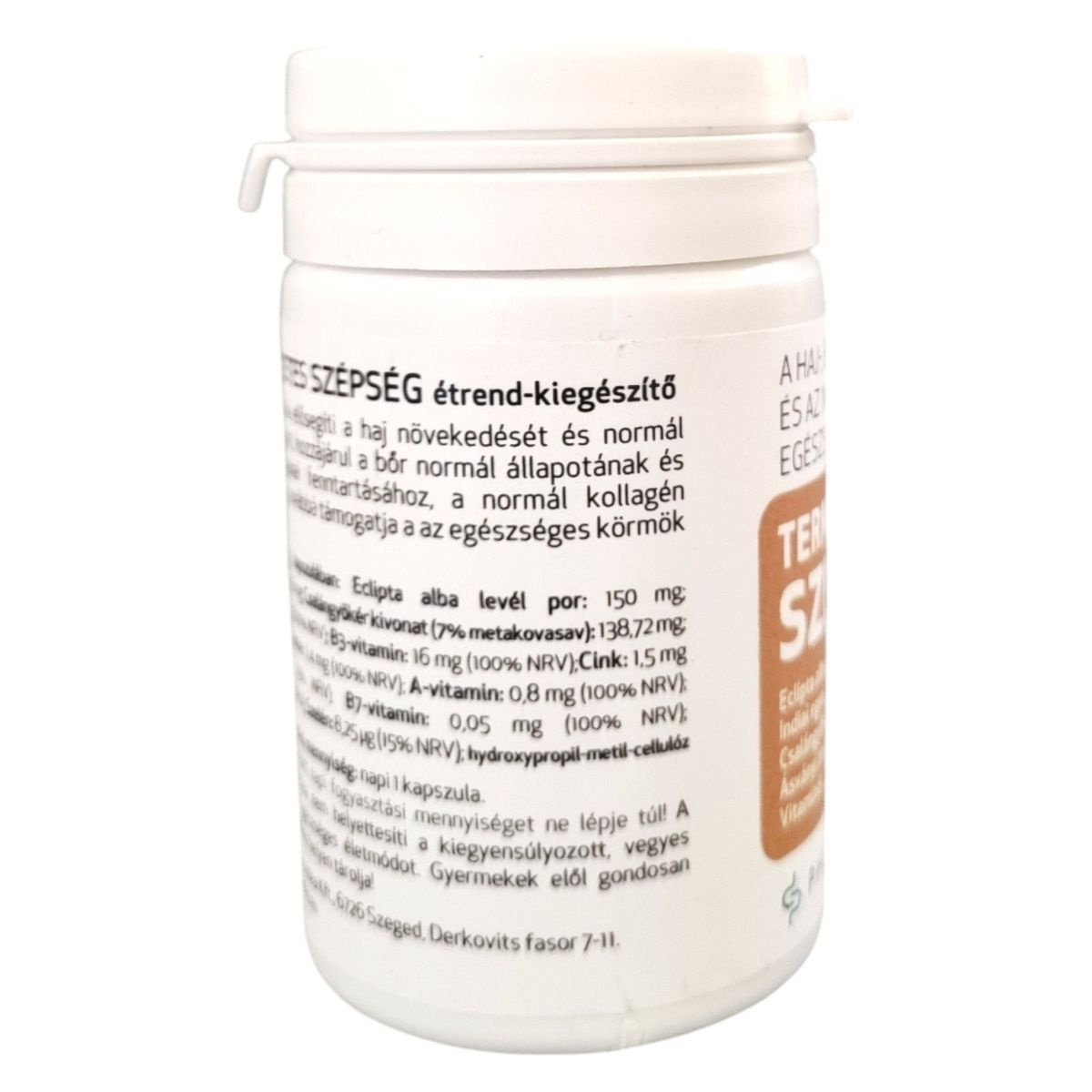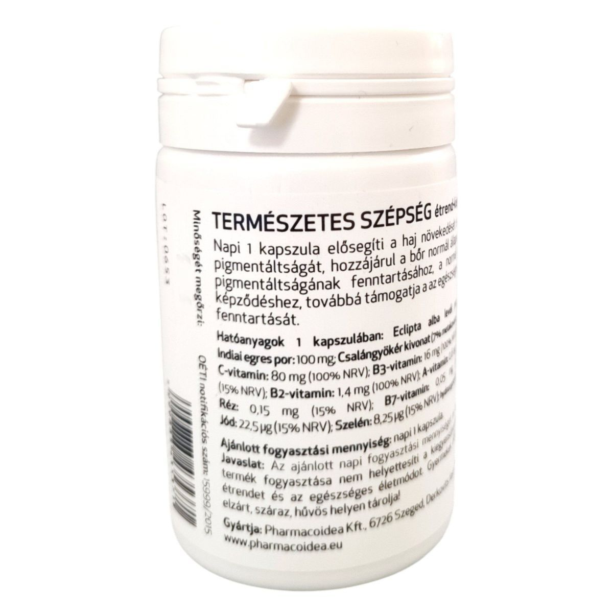 A TERMÉSZETES SZÉPSÉG étrend-kiegészítő napi 1 kapszula formájában segíthet a haj növekedésének és normál pigmentáltságának elősegítésében, valamint a bőr normál állapotának és pigmentáltságának fenntartásában. Továbbá támogathatja a normál kollagén képződést és az egészséges körmök fenntartását. A termék hatóanyagai között megtalálható az Eclipta alba levél por, indiai egres por, csalángyökér kivonat, valamint különböző vitaminok és ásványi anyagok, mint például a C-vitamin, B3-vitamin, cink, B2-vitamin, A-vitamin, réz, B7-vitamin, jód és szelén. A terméket a Pharmacoidea Kft. gyártja Szegeden.