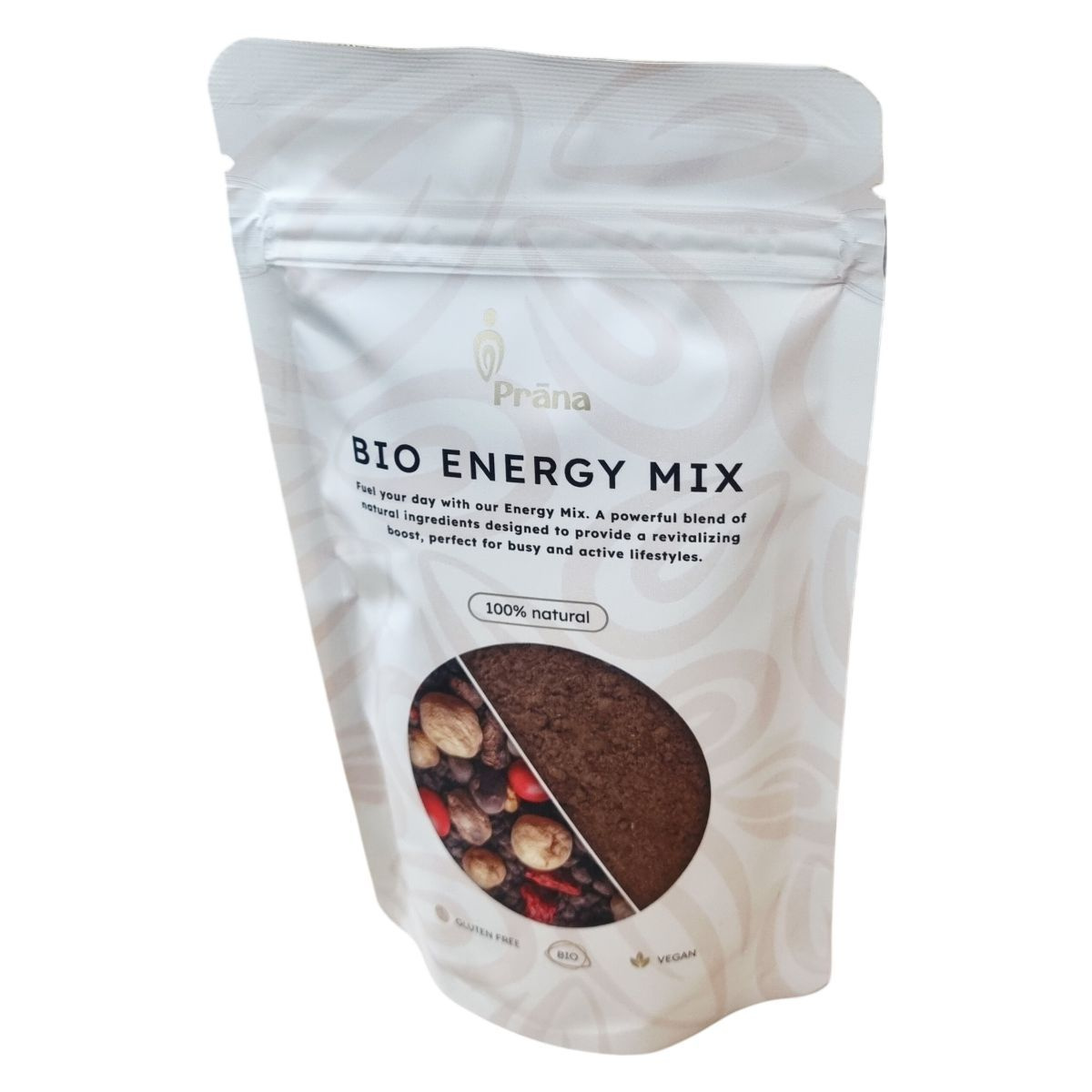 A Prāna BIO ENERGY MIX egy 100%-ban természetes alapanyagokból álló bio termék, amely összetett szuperélelmiszer-keveréket tartalmaz, például maca-, kakaó-, baobab-, lucuma-, ashwagandha-, reishi-, cékla-, matcha- és guarana porokat. A termék célja, hogy energizáljon és revitalizáljon a mindennapi elfoglaltságok során, különösen a gyors és aktív életmódot folytatók számára. Gluténmentes és vegán étrendbe is beilleszthető. A termék nyomokban földimogyorót, dióféléket és szezámmagot tartalmazhat, ezért allergiásoknak körültekintően ajánlott. A port a kedvenc italokhoz adagolva, alapos keverés vagy turmixolás után fogyasztható. Száraz, hűvös helyen kell tárolni a minőség megőrzése érdekében.