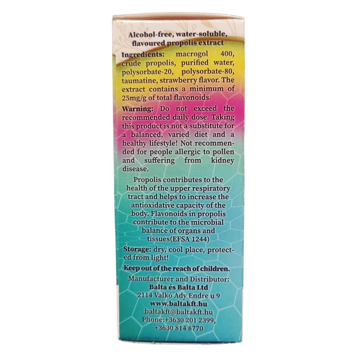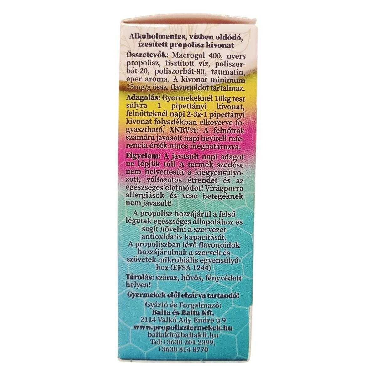 Alkoholmentes, vízben oldódó, ízesített propolisz kivonat gyermekek és felnőttek számára, amely a szervezet antioxidatív kapacitását és a légutak egészséges állapotát támogathatja.