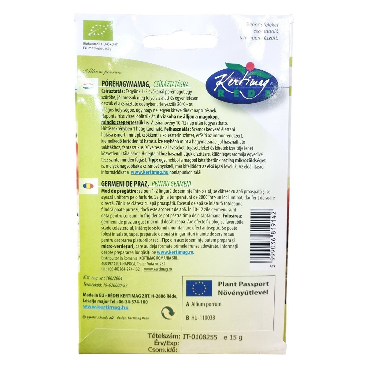 A póréhagymamag számos kedvező élettani hatással bír, például csökkenti a koleszterinszintet, erősíti az immunrendszert és kiemelkedő fertőtlenítő hatású. Az enyhébb ízű csíranövény jól használható sokféle ételben, fantasztikus ízt ad leveseknek, tojásételeknek és köreteknek. Hidegtálakra is kiváló díszítésként. Egyúttal a magból mikrozöldséget is nevelhetünk, mely nagyobb méretű, az első igazi levelekkel már rendelkező növény. Az előállításról további információk a hivatalos honlapon érhetőek el. A termék gabonaféléket csomagoló üzemben készült, és növényútlevéllel rendelkezik.