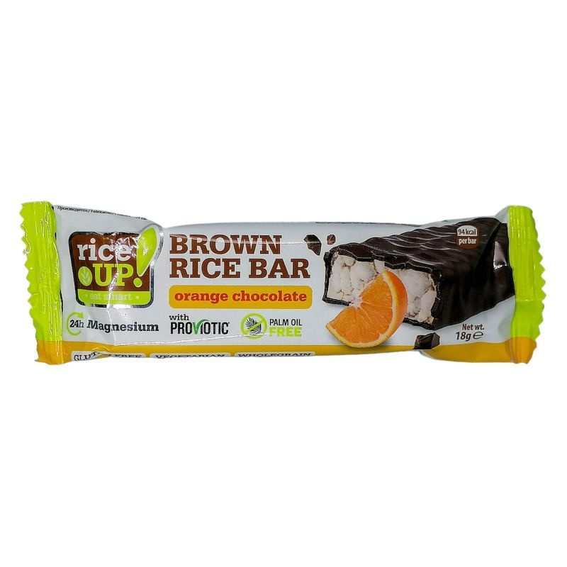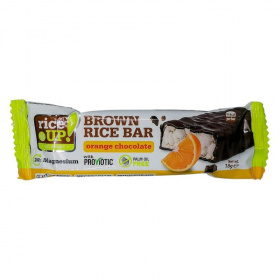 Rice Up puffasztott barna rizsszelet narancsos ízesítésű étcsokoládé bevonattal.