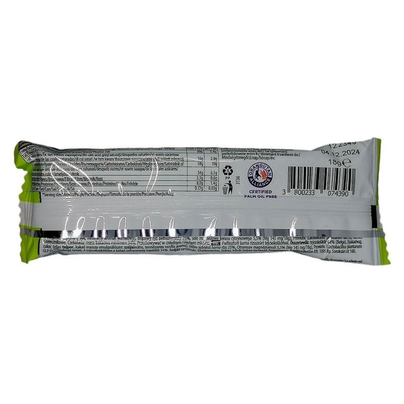 Összetevők: tejcsokoládé 68% (Belga) (kakaóvaj, cukor, teljes tejpor, kakaó massza, emulgeálószer: szójalecitin, természetes vanília aroma) teljes kiőrlésű barna rizs 25%, citromsav magnéziumsói 5,5% (Mg 145 mg/18g), Proviotic (Lactobacillus plantarum GLP3), napraforgó tahini.