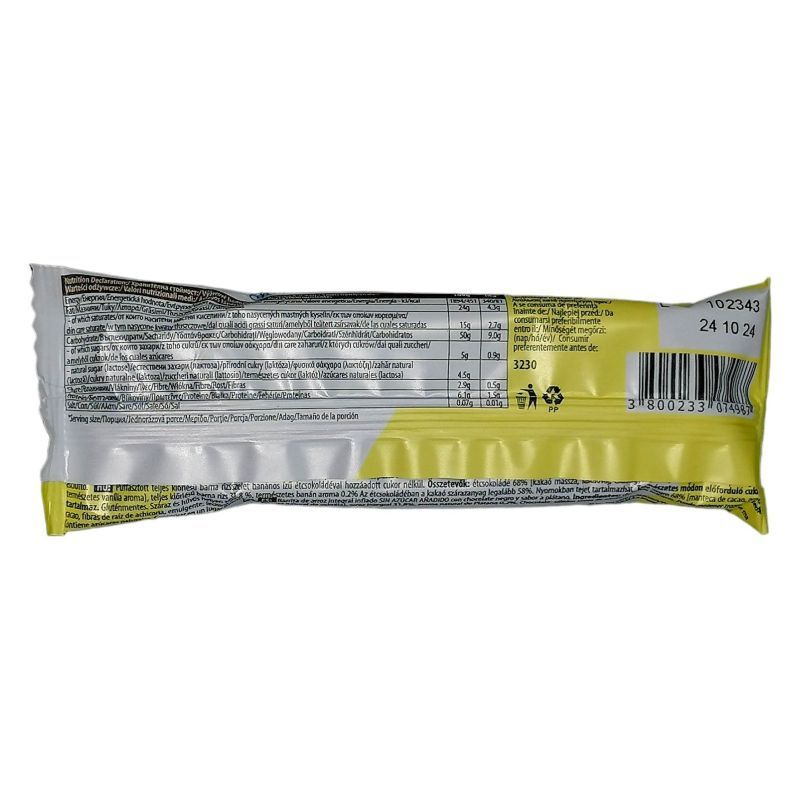 Összetevők: étcsokoládé 68% [kakaó massza, kakaóvaj, cikóriagyökér rost, emulgeálószer: napraforgólecitin, természetes vanília aroma], teljes kiőrlésű barna rizs 31,8 %, természetes banán aroma 0.2%.