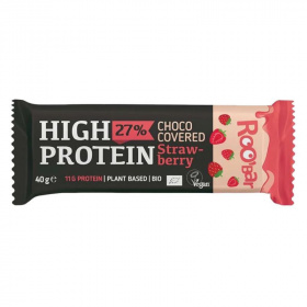 27%-os fehérjetartalommal, a texturált borsófehérje és a rizsfehérje harmonikus kombinációjának köszönhetően. A magas fehérjetartalmú Strawberry szelet finom rózsaszín funkyjával egy teljesen új, gyümölcsös frissességet hoz a márka fehérjetartományába!*biogazdálkodásból