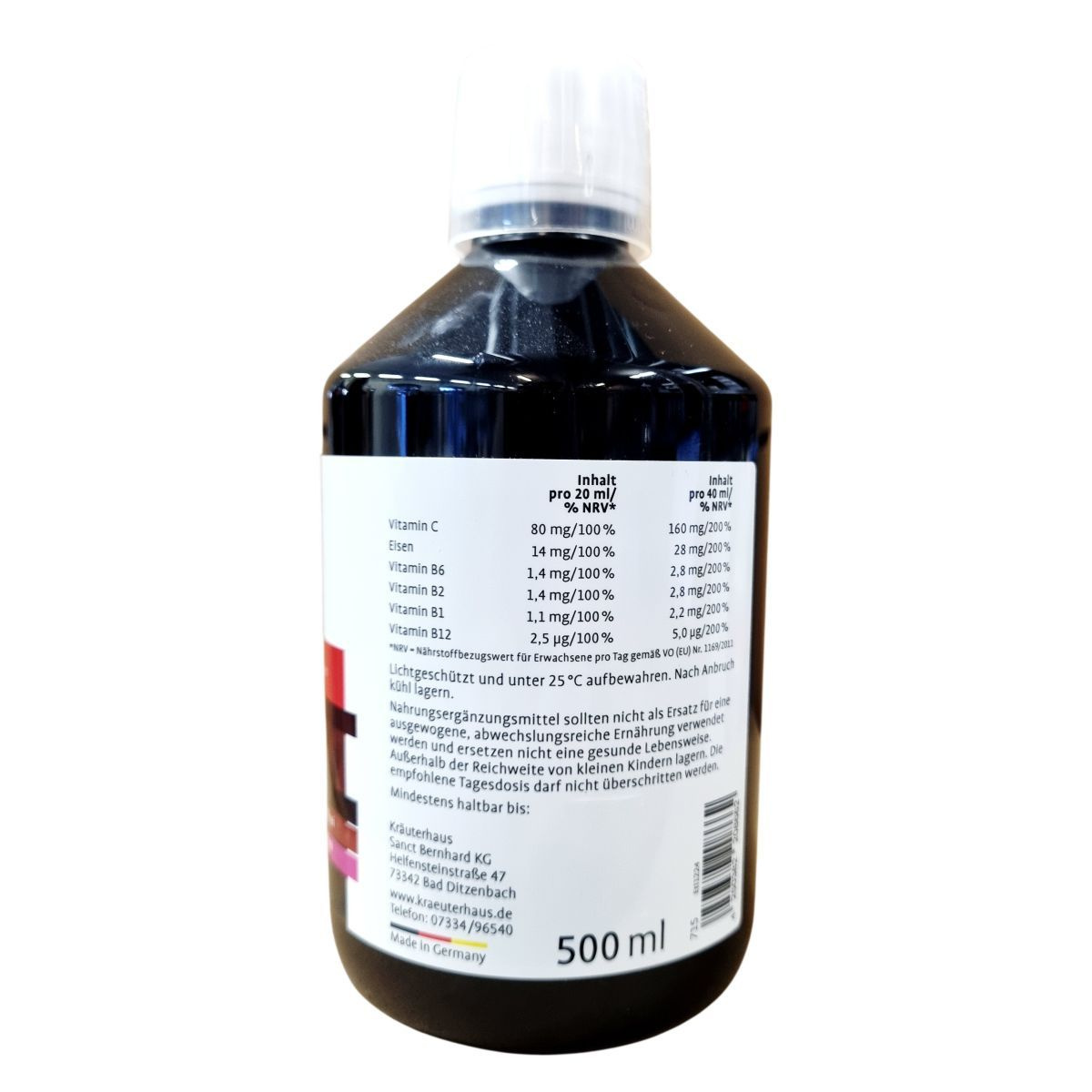 gyümölcskoncentrátum fekete berkenyéből, földieperből, fekete ribizliből, bodzából, víz, agave nektár, vas-glükonát (0,065% vas), C-vitamin, tartósítószer: kálium-szorbát, B6-vitamin (piridoxin-hidroklorid), B2-vitamin, B1-vitamin (tiamin-mononitrát), B12-vitamin
