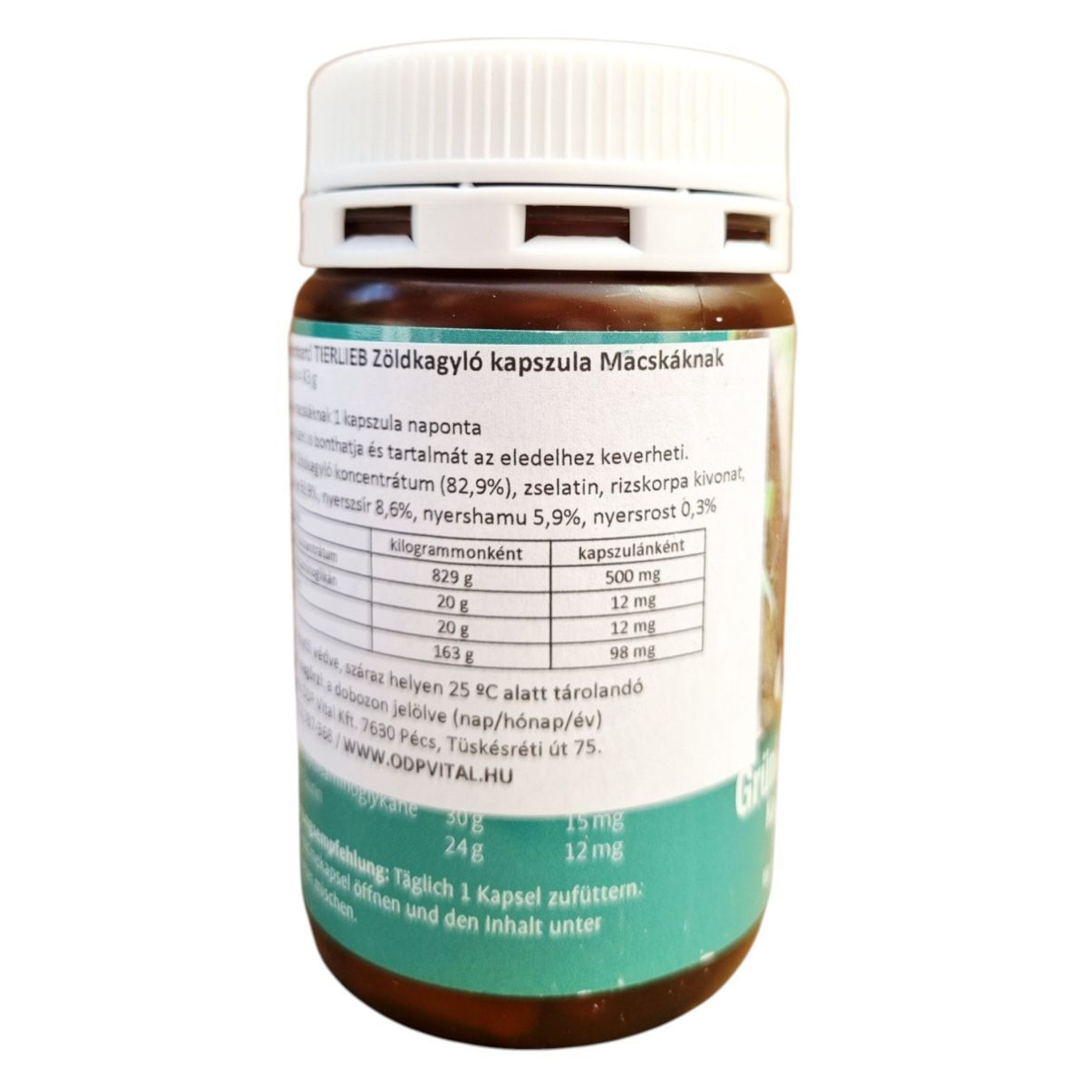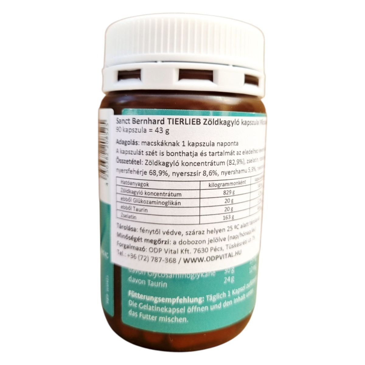 A Sanct Bernhard TIERLIEB Zöldkagyló kapszula kifejezetten macskáknak készült, és célja, hogy támogassa az ízületek és porcok egészségét. A termék fő összetevője a zöldkagyló koncentrátum, amely glükozaminoglikánt és taurint is tartalmazhat, hozzájárulva a macskák általános jólétéhez. A kapszulák könnyen adagolhatók, és akár az eledelhez is keverhetők. A terméket fénytől védve, száraz helyen, 25 °C alatt ajánlott tárolni. A forgalmazó az ODP Vital Kft., amely Pécsen található.