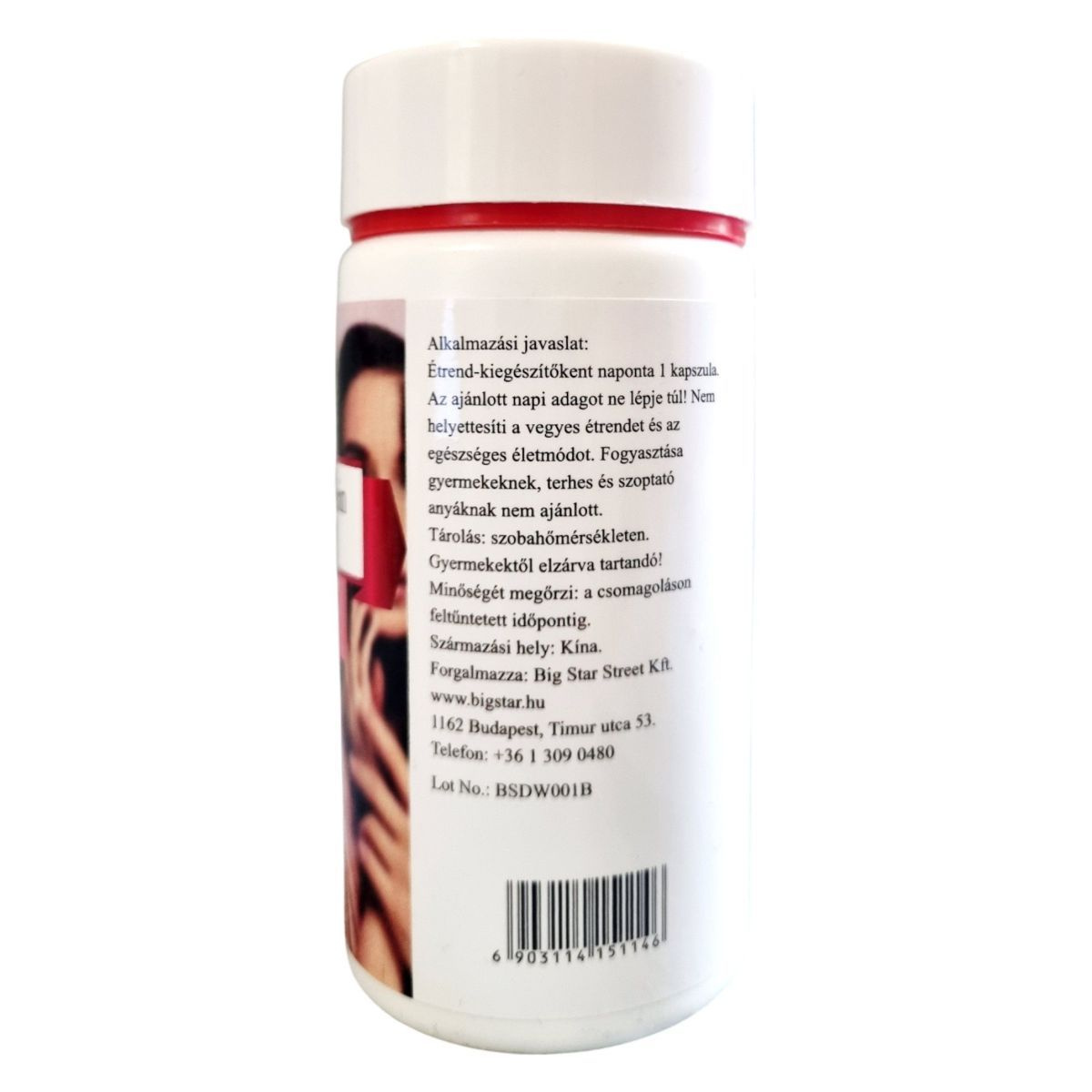 A Szépség Multivitamin étrend-kiegészítő kapszula célja, hogy támogassa a haj, bőr és köröm egészségét. A termék különféle vitaminokat és ásványi anyagokat tartalmaz, mint például C-vitamin, E-vitamin, cink és kollagén, amelyek hozzájárulhatnak a bőr normál állapotának fenntartásához. Az étrend-kiegészítő napi egy kapszula formájában fogyasztható, és nem helyettesíti a vegyes étrendet és az egészséges életmódot. A termék Kínából származik, és a Big Star Street Kft. forgalmazza Magyarországon.