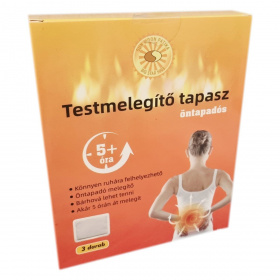 A Testmelegítő tapasz egy öntapadós, könnyen használható melegítő eszköz, amely ruhára helyezve akár 5 órán keresztül hőt biztosít. A csomagoláson szereplő ikonok több alkalmazási területet is mutatnak (váll, has, hát, derék régió). A termék vasport, vermikulitot és aktív szenet tartalmaz, amelyek a levegővel érintkezve hőtermelő reakcióba lépnek. Kizárólag ruhára helyezhető, közvetlen bőrkontaktus esetén irritáció léphet fel. A doboz 3 darab tapaszt tartalmaz, és a forgalmazó a Big Star Street Kft.