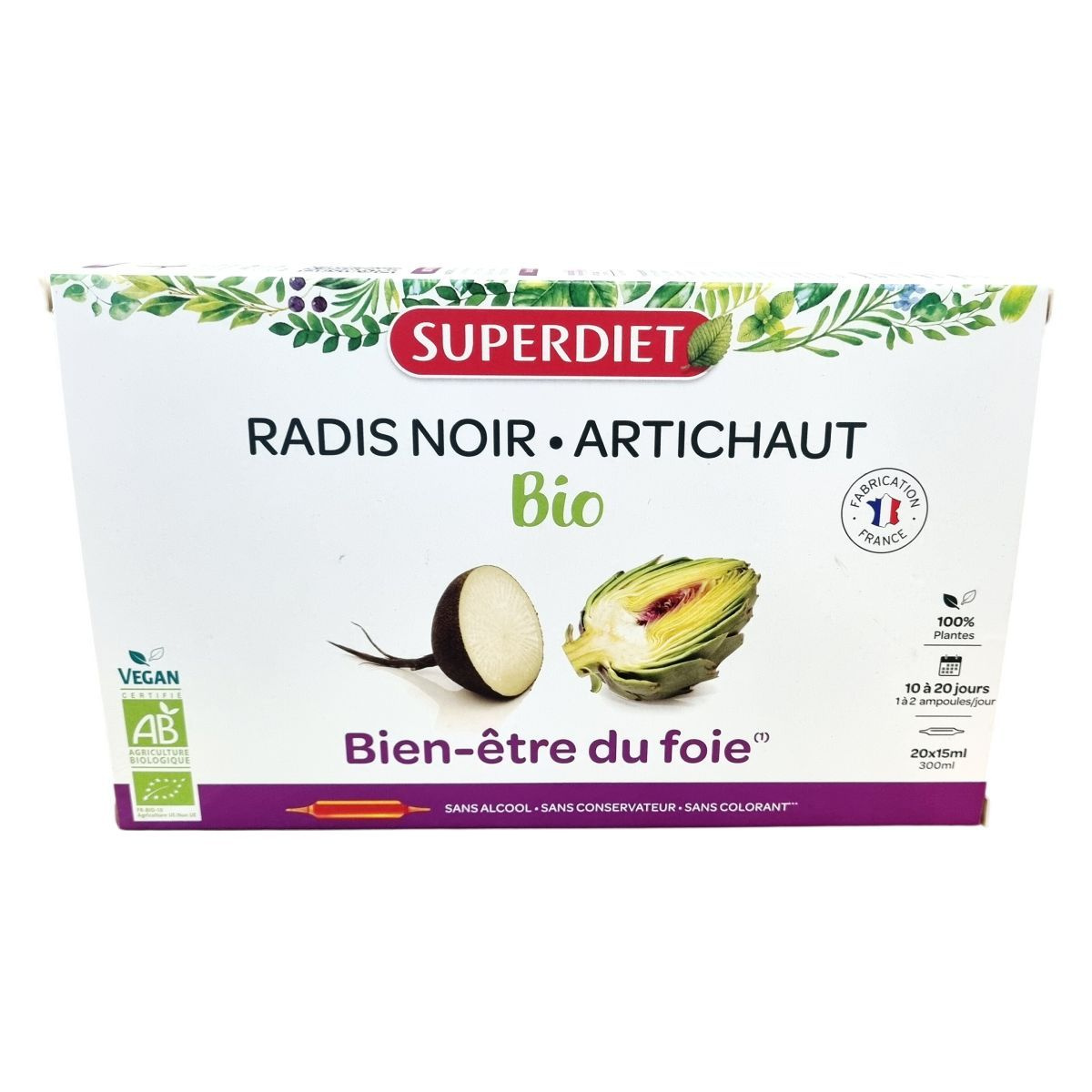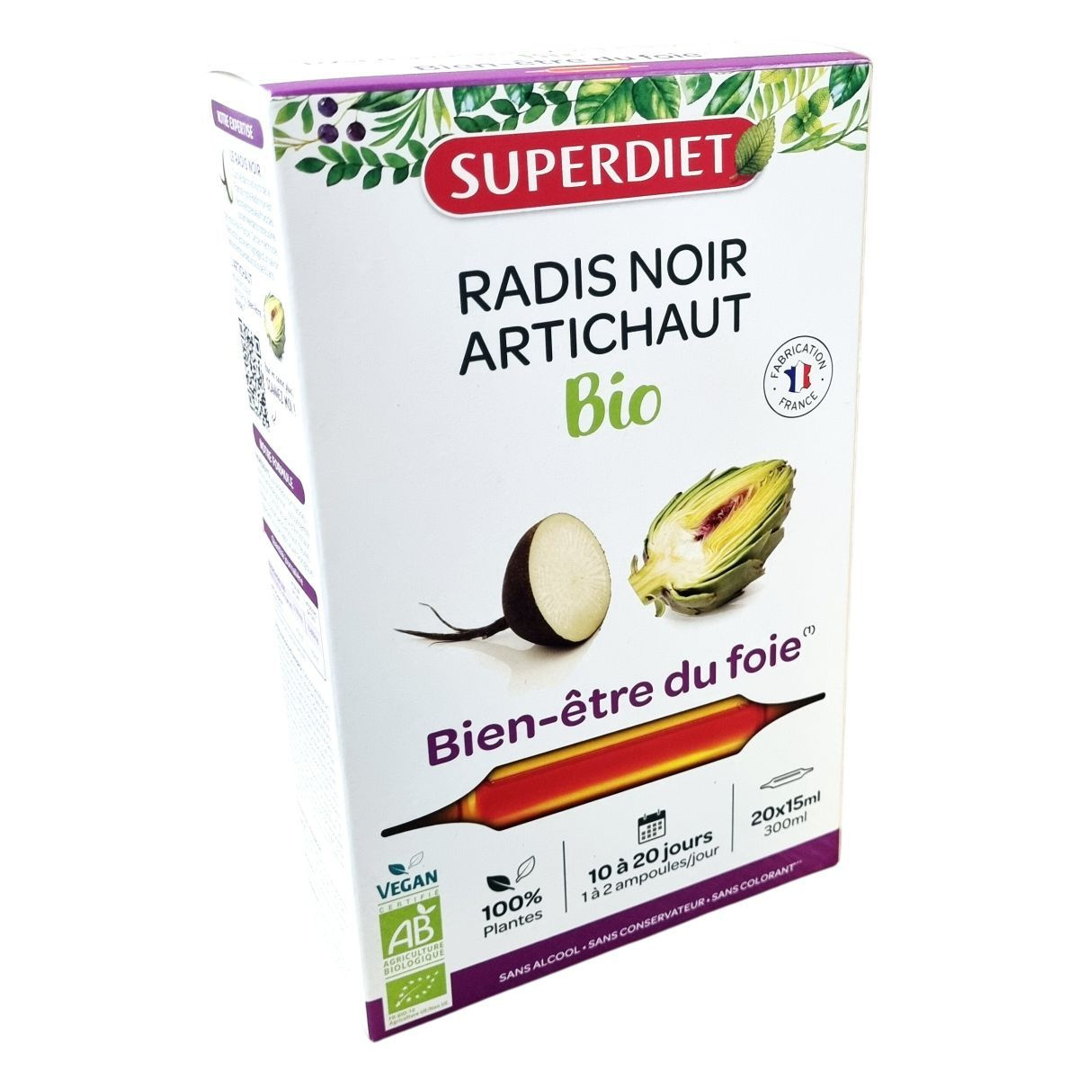 A termék fekete retekből és articsókából készült bio növényi koncentrátum, melynek alapanyagai Észak-Franciaországban, a gyártó közelében termesztett és hidegen sajtolt fekete retek, valamint levél- és száraz kivonat formában használt articsóka. A hidegsajtolásos módszer több mint 60 éves tapasztalatot tükröz. A formula nem tartalmaz alkoholt, tartósítószert és színezőanyagot, az összetevők mind biogazdálkodásból származnak. A termék használata javasolt felnőtt férfiaknak, nőknek és 12 éves kortól serdülőknek, különösen májvédelmi célból. Az ampullák könnyen nyithatóak, és használat előtt fel kell rázni őket. A termék kizárólag orális alkalmazásra készült, nem alkalmas injekciós beadásra. A precíz adagolás betartása és az egészséges életmód fenntartása ajánlott a készítmény alkalmazása mellett.