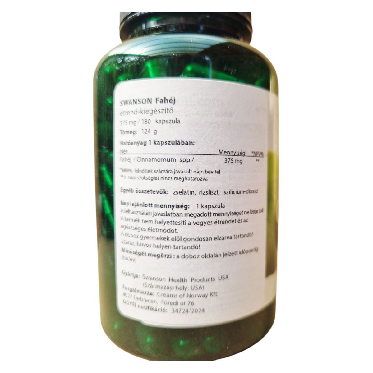 A Swanson Fahéj étrend-kiegészítő kapszulánként 375 mg fahéjat tartalmaz, amelyet a vércukorszint támogatására fejlesztettek ki. A termék 180 kapszulát tartalmaz, és a napi ajánlott mennyiség 1 kapszula. Az összetevők között megtalálható a zselatin, rizsliszt és szilícium-dioxid. A termék nem helyettesíti a vegyes étrendet és az egészséges életmódot, és gyermekek elől elzárva tartandó. A Swanson Health Products által gyártott termék OGYÉI notifikációval rendelkezik.