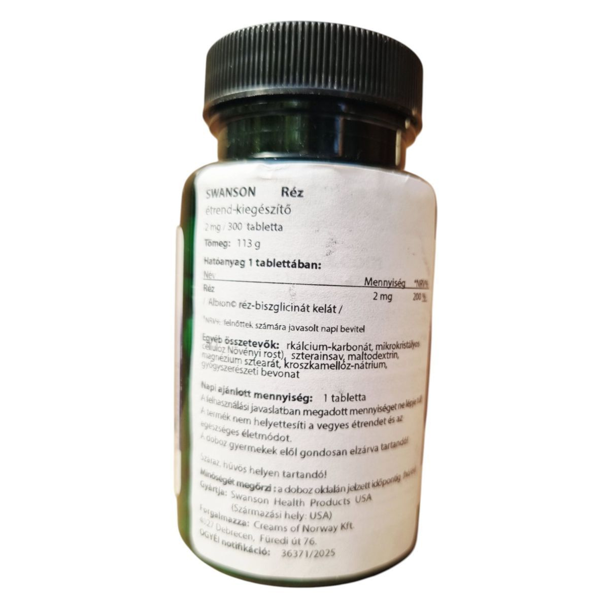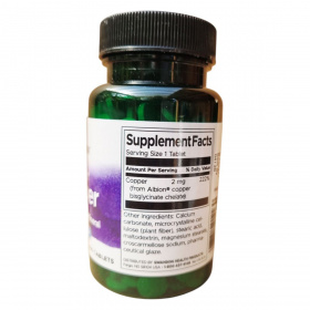 A SWANSON Albion® Copper egy 300 tablettás kiszerelésű étrend-kiegészítő, amely réz-biszglicinát kelát formájában tartalmaz 2 mg rezet tablettánként. Ez a forma segíthet a réz hatékony felszívódásában. A termék összetevői között megtalálható a kálcium-karbonát, mikrokristályos cellulóz, sztearinsav, maltodextrin, magnézium-sztearát, kroszkarmellóz-nátrium és gyógyszerészeti bevonat. A termék napi ajánlott mennyisége 1 tabletta, amely a felnőttek számára javasolt napi rézbevitel 200%-át biztosíthatja. Fontos, hogy a terméket száraz, hűvös helyen tároljuk, és gyermekek elől elzárva tartsuk. A termék nem helyettesíti a vegyes étrendet és az egészséges életmódot.