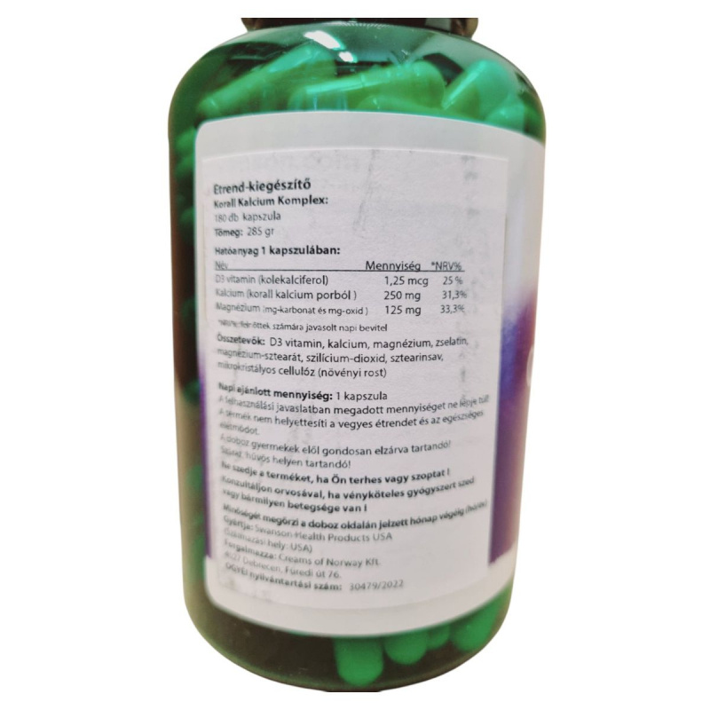 A Swanson Korall Kalcium Komplex kapszula egy étrend-kiegészítő, amely D3 vitamint, kalciumot és magnéziumot tartalmaz. Ezek az összetevők hozzájárulhatnak a csontok és az izmok normál működésének fenntartásához. A termék napi ajánlott adagja 1 kapszula, amely biztosítja a szükséges hatóanyagokat a szervezet számára. A termék nem helyettesíti a vegyes étrendet és az egészséges életmódot, és fontos, hogy a felhasználási javaslatban megadott mennyiséget ne lépje túl. A kapszulák zselatint tartalmaznak, ezért vegetáriánusok számára nem ajánlott. A terméket száraz, hűvös helyen kell tárolni, és gyermekek elől elzárva tartani. A gyártó Swanson Health Products, és a forgalmazó Creams of Norway Kft.