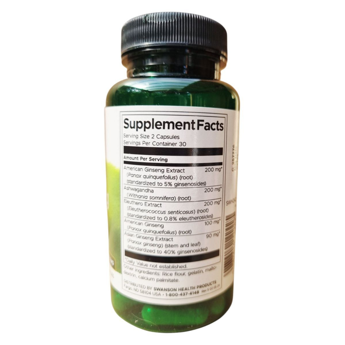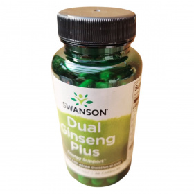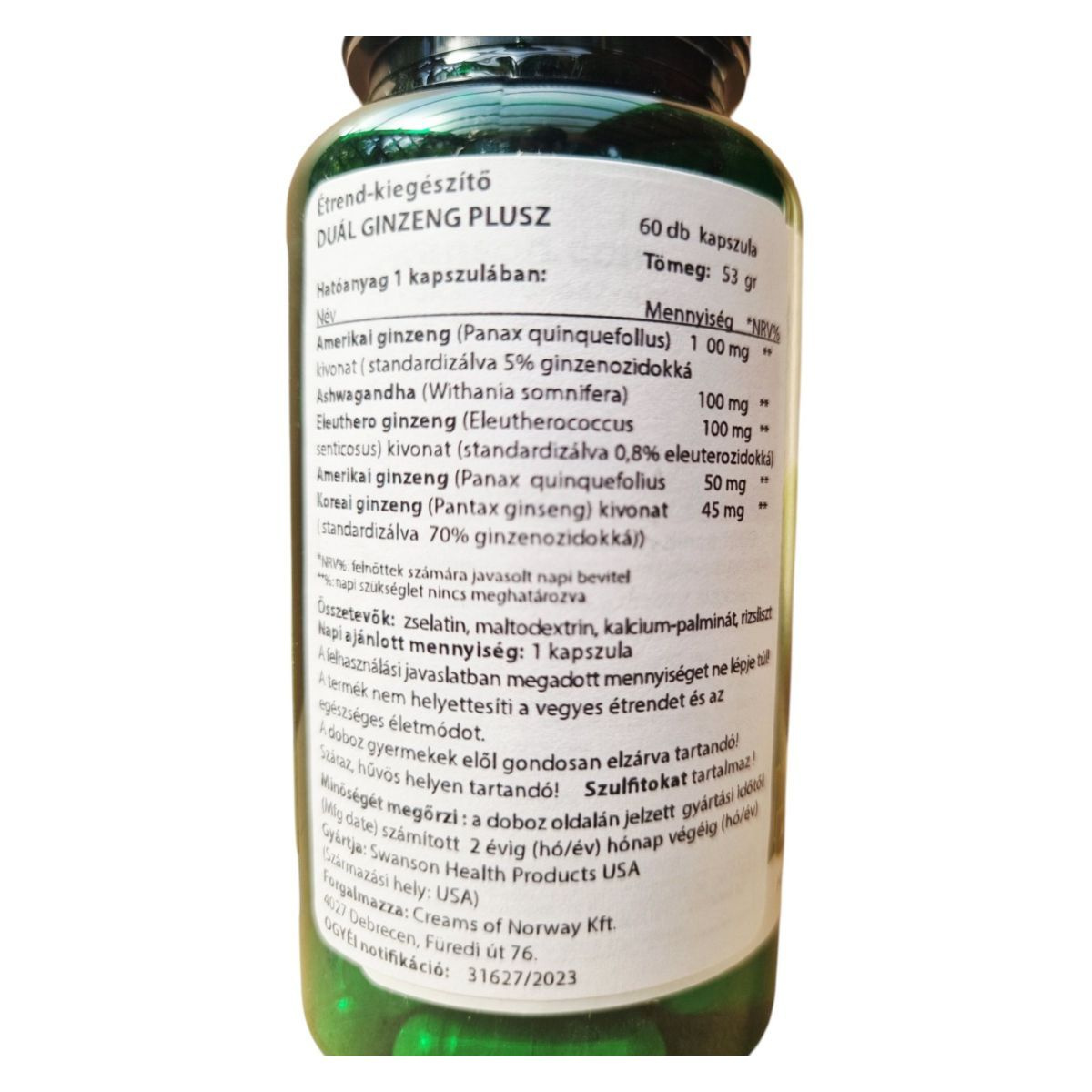 A Swanson Dual Ginseng Plus egy különleges étrend-kiegészítő, amely az amerikai és ázsiai ginzeng kivonatok mellett ashwagandhát is tartalmaz. Ezek a növényi összetevők hozzájárulhatnak az energiaszint fenntartásához és a stressz kezeléséhez. A termék napi ajánlott mennyisége 1 kapszula, amelyet nem szabad túllépni. Az összetevők között található zselatin, maltodextrin, kalcium-palminát és rizsliszt. A termék szulfitokat tartalmaz, ezért fontos, hogy a dobozt gyermekek elől elzárva tartsuk, és száraz, hűvös helyen tároljuk. A termék nem helyettesíti a vegyes étrendet és az egészséges életmódot. Gyártja a Swanson Health Products, forgalmazza a Creams of Norway Kft.
